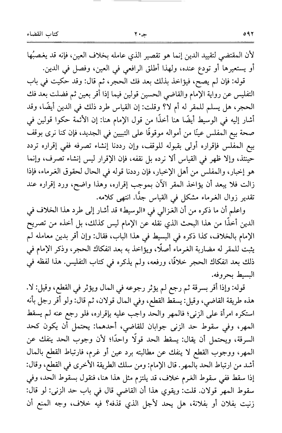 قوله: فإن لم يصح، فيؤاخذ بذلك بعد فك الحجر، ثم قال: وقد حكيت في باب التفليس عن رواية الإمام والقاضي الحسين قولين فيما إذا أقر بعين ثم فضلت بعد فك الحجر، هل يسلم للمقر له أم لا؟ وقلت: إن القياس طرد ذلك في الدين أيضًا، وقد أشار إليه في الوسيط أيضًا هنا أخذًا من قول الإمام هنا: إن الأئمة حكوا قولين في صحة بيع المفلس عينًا من أمواله موقوفًا على التبيين في الجديد، فإن كنا نرى بوقف بيع المفلس فإقراره بقبوله للوقف، وإن رددنا إنشاء تصرفه ففي إقراره تردد حينئذ، وإلا ظهر في القياس ألا نرده بل نقفه، فإن الإقرار ليس إنشاء تصرف، وإنما هو إخبار، والمفلس من أهل الإخبار، فإن رددنا قوله في الحال لحقوق الغرماء، فإذا زالت فلا يبعد أن يؤاخذ المقر الآن بموجب إقراره، وهذا واضح، ورد إقراره عند تقدير زوال الغرماء مشكل في القياس جدًا. انتهى كلامه.