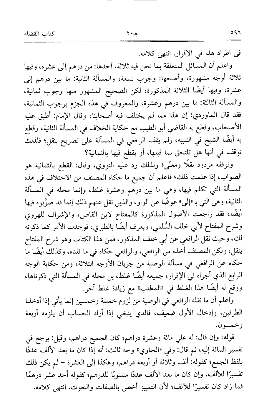 وتوقفه مردود نقلًا ومعنى، ولذلك رد عليه النووي، وقال: القطع بالثمانية هو الصواب، إذا علمت ذلك، فاعلم أن جميع ما حكاه المصنف من الاختلاف في هذه المسألة التي تكلم فيها، وهي ما بين درهم وعشرة غلط، وإنما محله في المسألة الثانية، وهي التي ترد بـ ((إلى)) عوضًا عن الواو، والذين نقل عنهم ذلك إنما قد صوبوه فيها أيضًا، فقد راجعت الأصول المذكورة كالمفتاح لابن القاص، والإشراف للهروي وشرح المفتاح لأبي خلف السملي، ويعرف أيضًا بالطبري، فوجدت الأمر كما ذكرته لك، وحيث نقل الرافعي عن أبي خلف المذكور، فمن هذا الكتاب وهو شرح المفتاح ينقل، ولكن المصنف أخذه من الرافعي، والرافعي حكاه في ما قلناه، وكذلك أيضًا ما حكاه عن الرافعي في مسألة الوصية من جريان الأوجه الثلاثة، ومن حكاية الوجه الرابع الذي أجراه في الإقرار، جميعه أيضًا غلط، بل محله في المسألة التي ذكرناها، وقع له أيضًا هذا الغلط في ((المطلب)) مع زيادة غلط آخر.