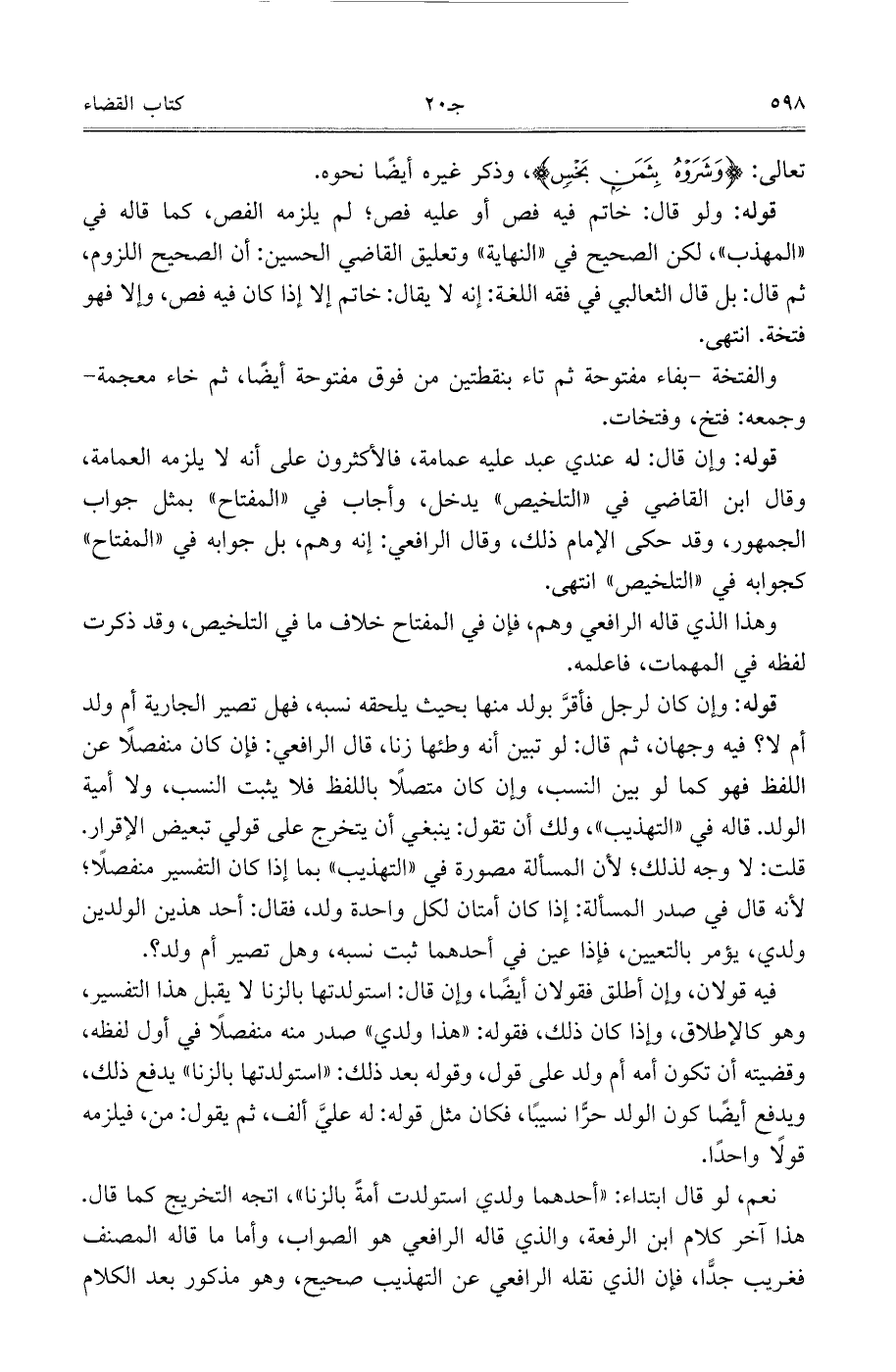 نعم، لو قال ابتداء: ((أحدهما ولدي استولدت أمةً بالزنا))، اتجه التخريج كما قال. هذا آخر كلام ابن الرفعة، والذي قاله الرافعي هو الصواب، وأما ما قاله المصنف فغريب جدًا، فإن الذي نقله الرافعي عن التهذيب صحيح، وهو مذكور بعد الكلام