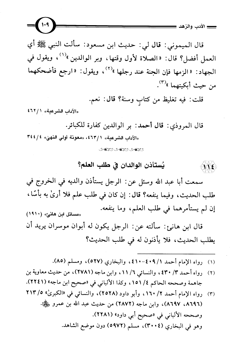 سمعت أبا عبد اللَّه وسئل عن: الرجل يستأذن والديه في الخروج في طلب الحديث، وفيما ينفعه؟ قال: إن كان في طلب علم فلا أرى به بأسًا، إن لم يستأمرهما في طلب العلم، وما ينفعه.