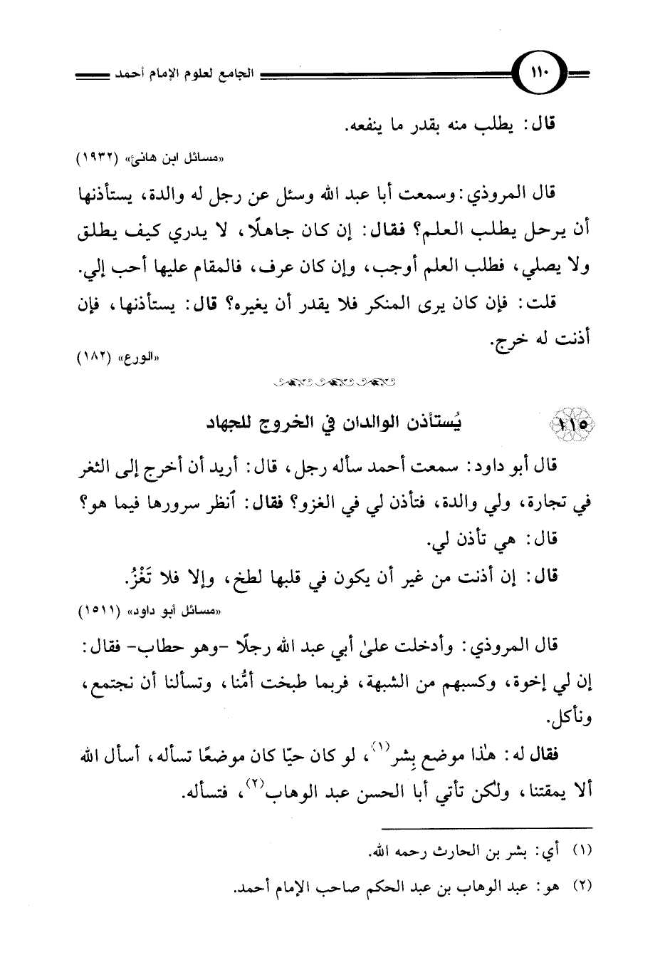 قال المروذي: وسمعت أبا عبد اللَّه وسئل عن رجل له والدة، يستأذنها أن يرحل يطلب العلم؟ فقال: إن كان جاهلًا، لا يدري كيف يطلق ولا يصلي، فطلب العلم أوجب، وإن كان عرف، فالمقام عليها أحب إلي.