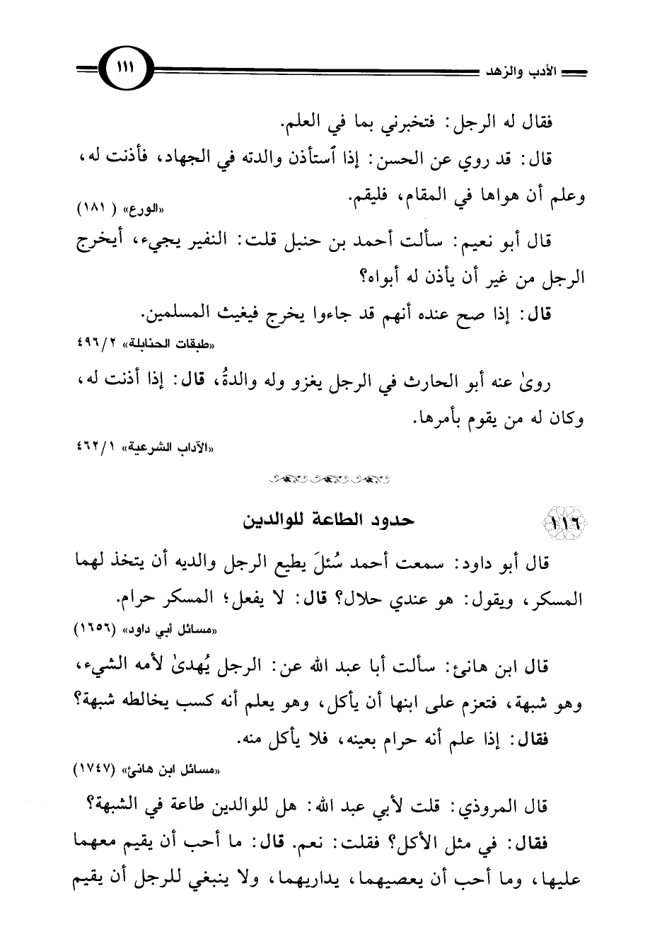قال المروذي: قلت لأبي عبد اللَّه: هل للوالدين طاعة في الشبهة؟