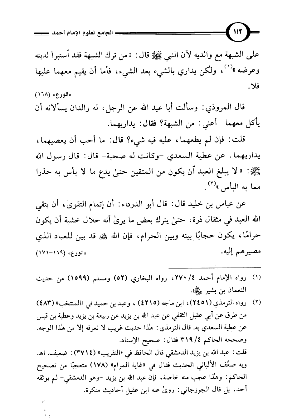قلت: فإن لم يطعهما، عليه فيه شيء؟ قال: ما أحب أن يعصيهما، يداريهما. عن عطية السعدي -وكانت له صحبة- قال: قال رسول اللَّه -صلى اللَّه عليه وسلم-: "لا يبلغ العبد أن يكون من المتقين حتى يدع ما لا بأس به حذرا مما به البأس" (¬2).