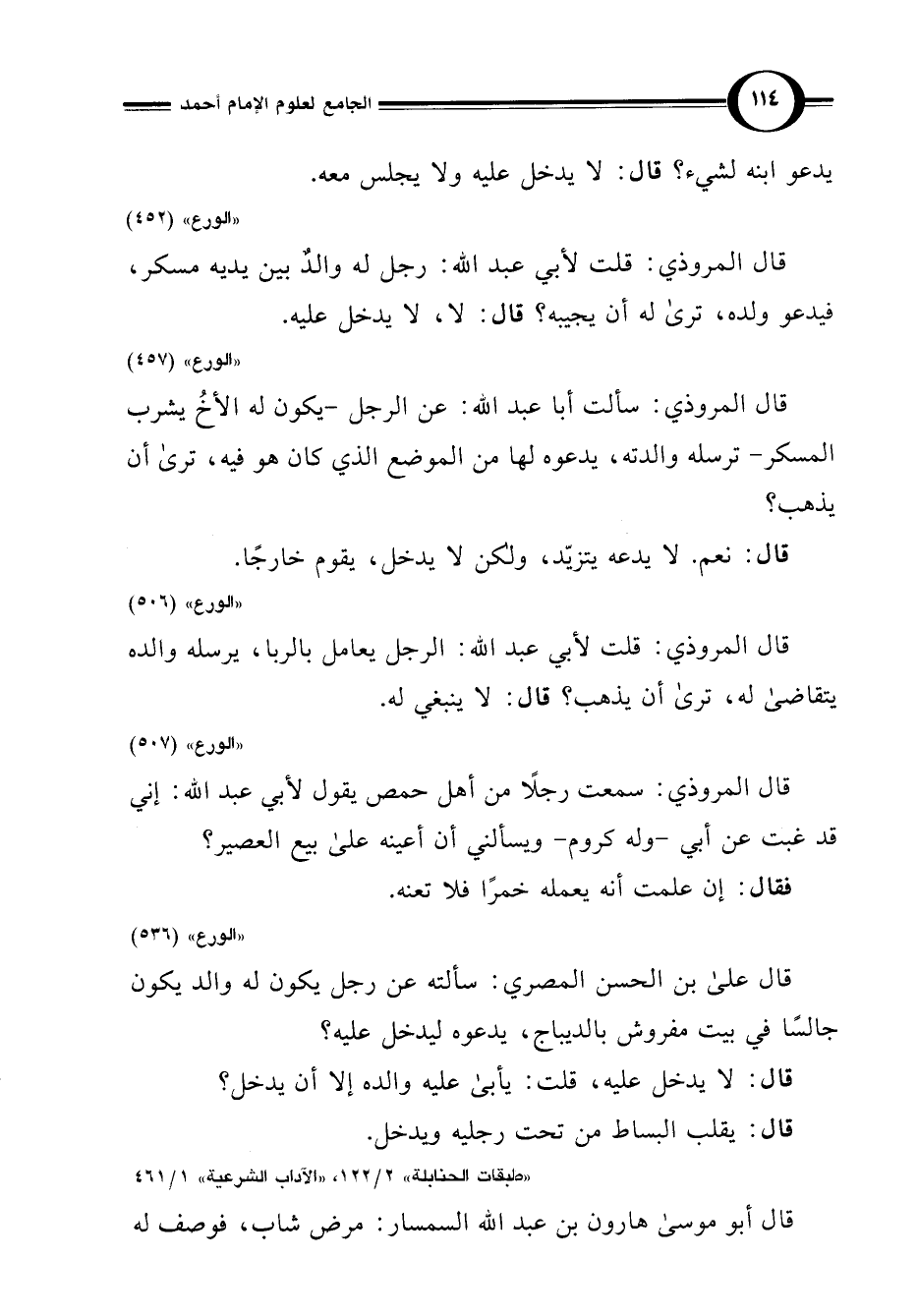 قال علي بن الحسن المصري: سألته عن رجل يكون له والد يكون جالسًا في بيت مفروش بالديباج، يدعوه ليدخل عليه؟