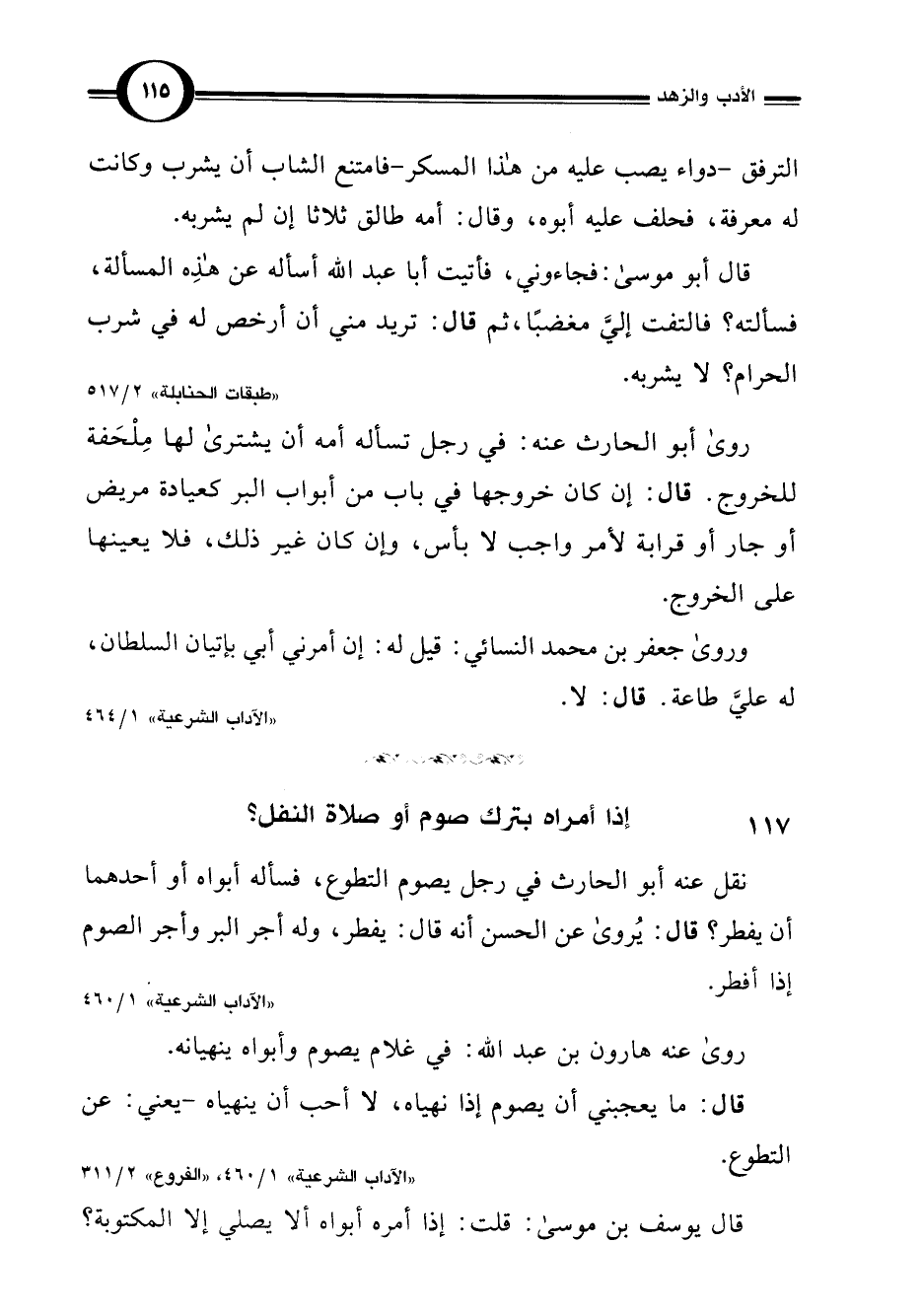 قال يوسف بن موسى: قلت: إذا أمره أبواه ألا يصلي إلا المكتوبة؟