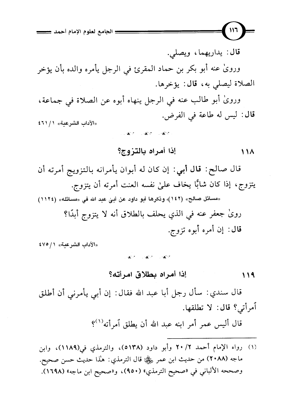 قال سندي: سأل رجل أبا عبد اللَّه فقال: إن أبي يأمرني أن أطلق امرأتي؟ قال: لا تطلقها.