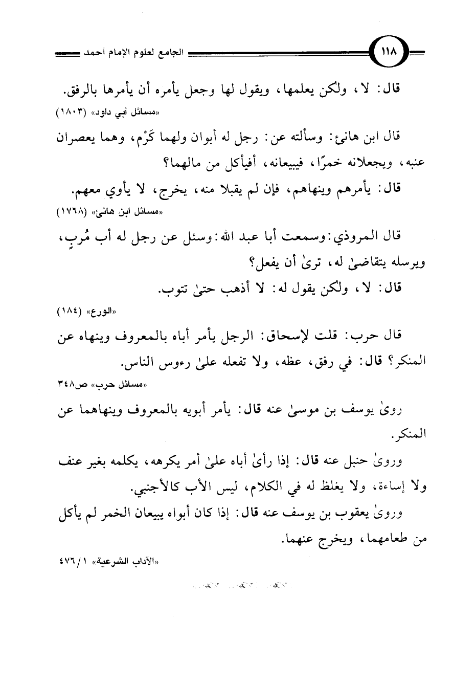 وروى حنبل عنه قال: إذا رأى أباه على أمر يكرهه، يكلمه بغير عنف ولا إساءة، ولا يغلظ له في الكلام، ليس الأب كالأجنبي.