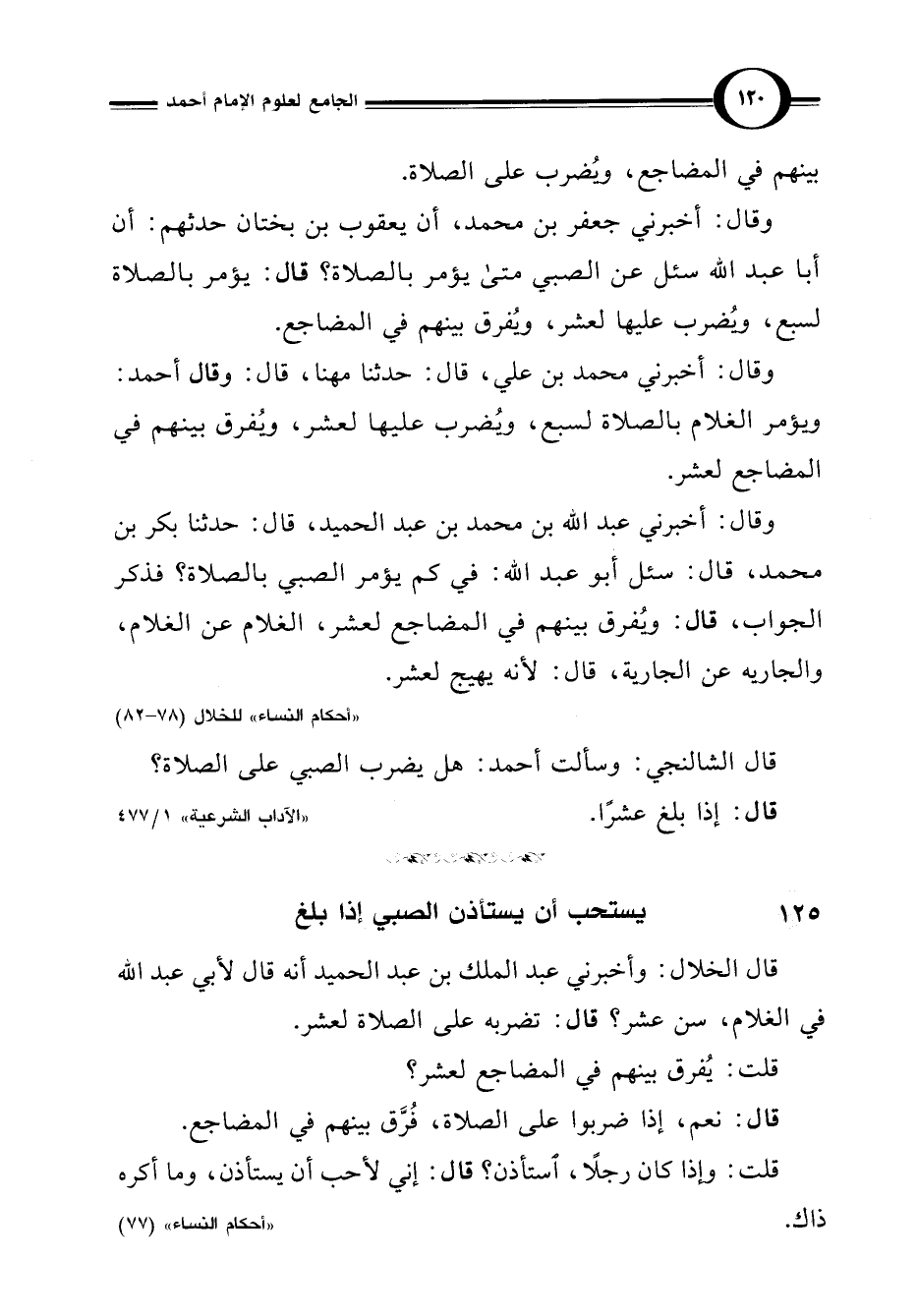 وقال: أخبرني محمد بن علي، قال: حدثنا مهنا، قال: وقال أحمد: ويؤمر الغلام بالصلاة لسبع، ويُضرب عليها لعشر، ويُفرق بينهم في المضاجع لعشر.