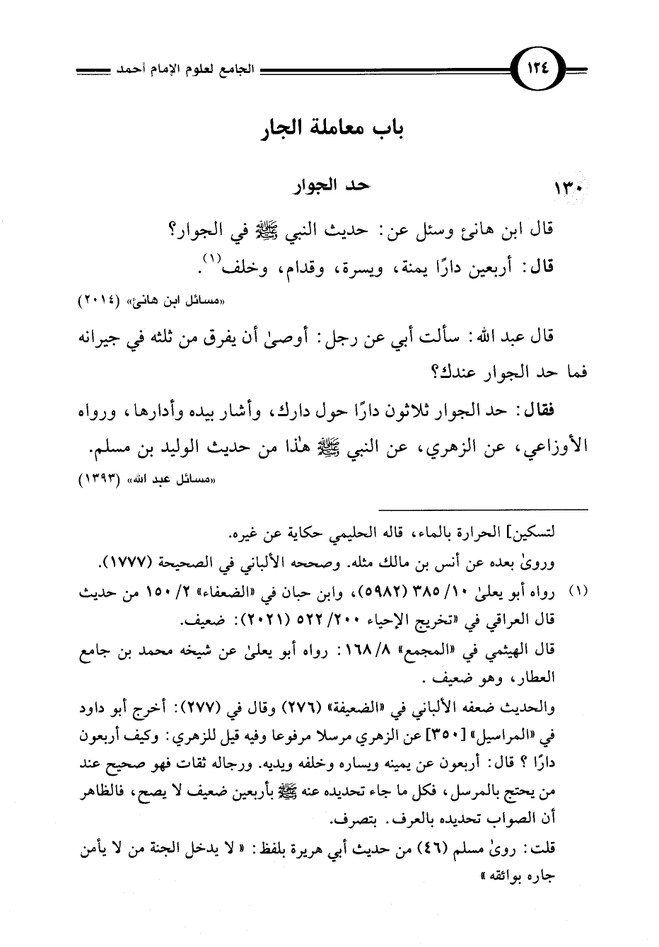 قال ابن هانئ وسئل عن: حديث النبي -صلى اللَّه عليه وسلم- في الجوار؟