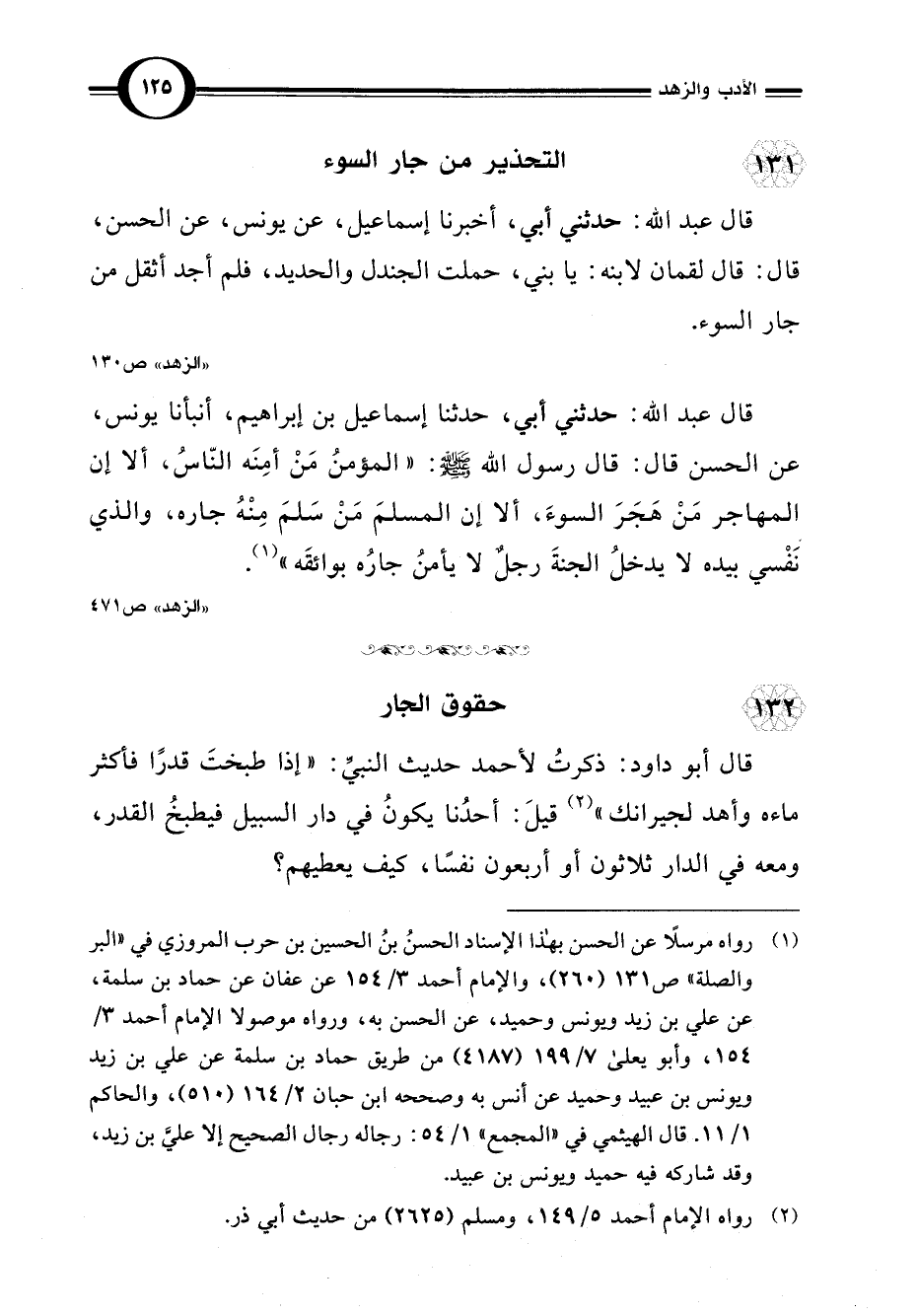 قال أبو داود: ذكرتُ لأحمد حديث النبيِّ: "إذا طبختَ قدرًا فأكثر ماءه وأهد لجيرانك" (¬2) قيلَ: أحذنا يكونُ في دار السبيل فيطبخُ القدر، ومعه في الدار ثلاثون أو أربعون نفسًا، كيف يعطيهم؟