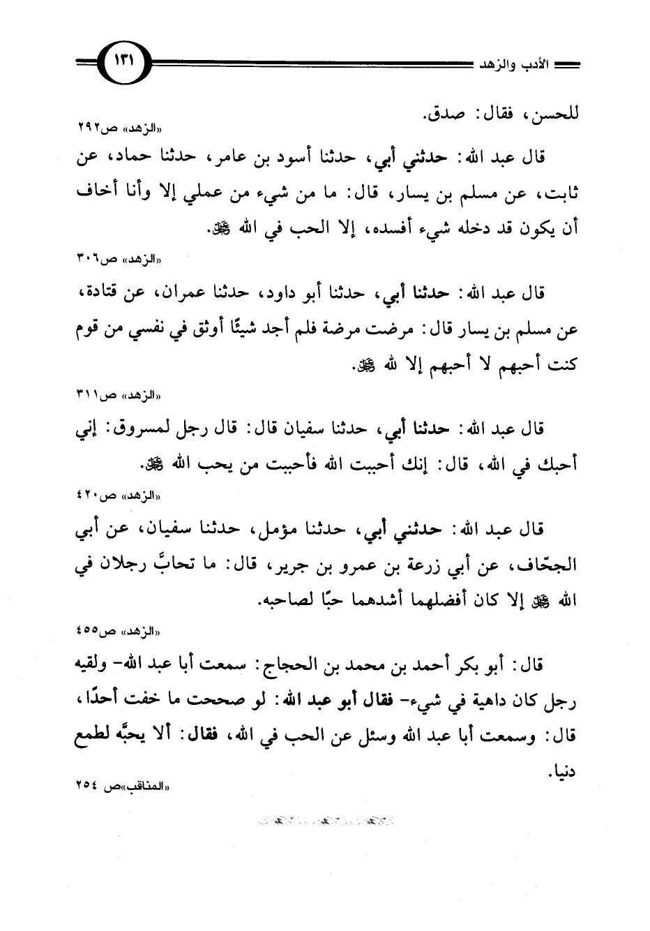 قال عبد اللَّه: حدثنا أبي، حدثنا سفيان قال: قال رجل لمسروق: إني أحبك في اللَّه، قال: إنك أحببت اللَّه فأحببت من يحب اللَّه عز وجل.