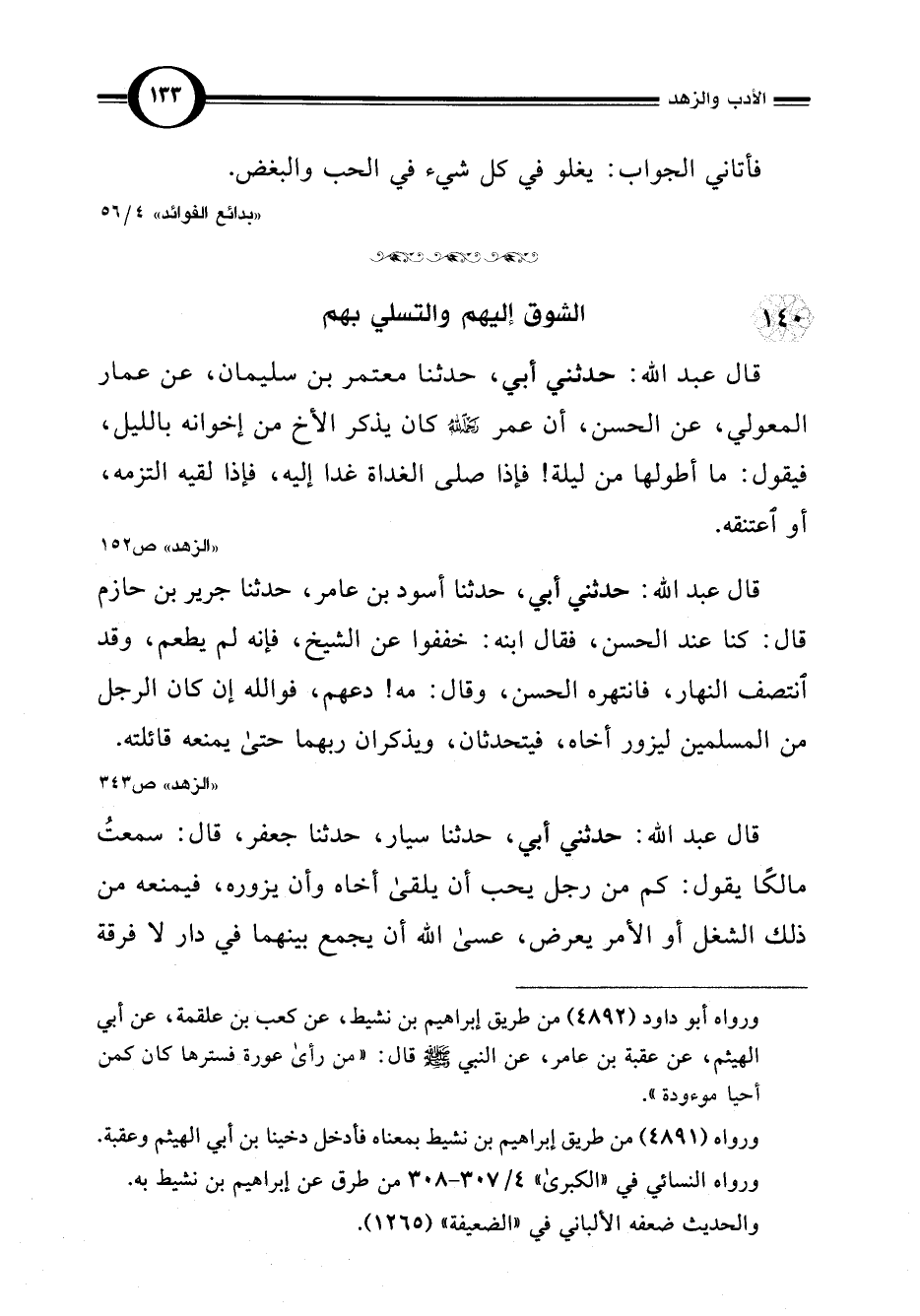 قال عبد اللَّه: حدثني أبي، حدثنا سيار، حدثنا جعفر، قال: سمعتُ مالكًا يقول: كم من رجل يحب أن يلقى أخاه وأن يزوره، فيمنعه من ذلك الشغل أو الأمر يعرض، عسى اللَّه أن يجمع بينهما في دار لا فرقة