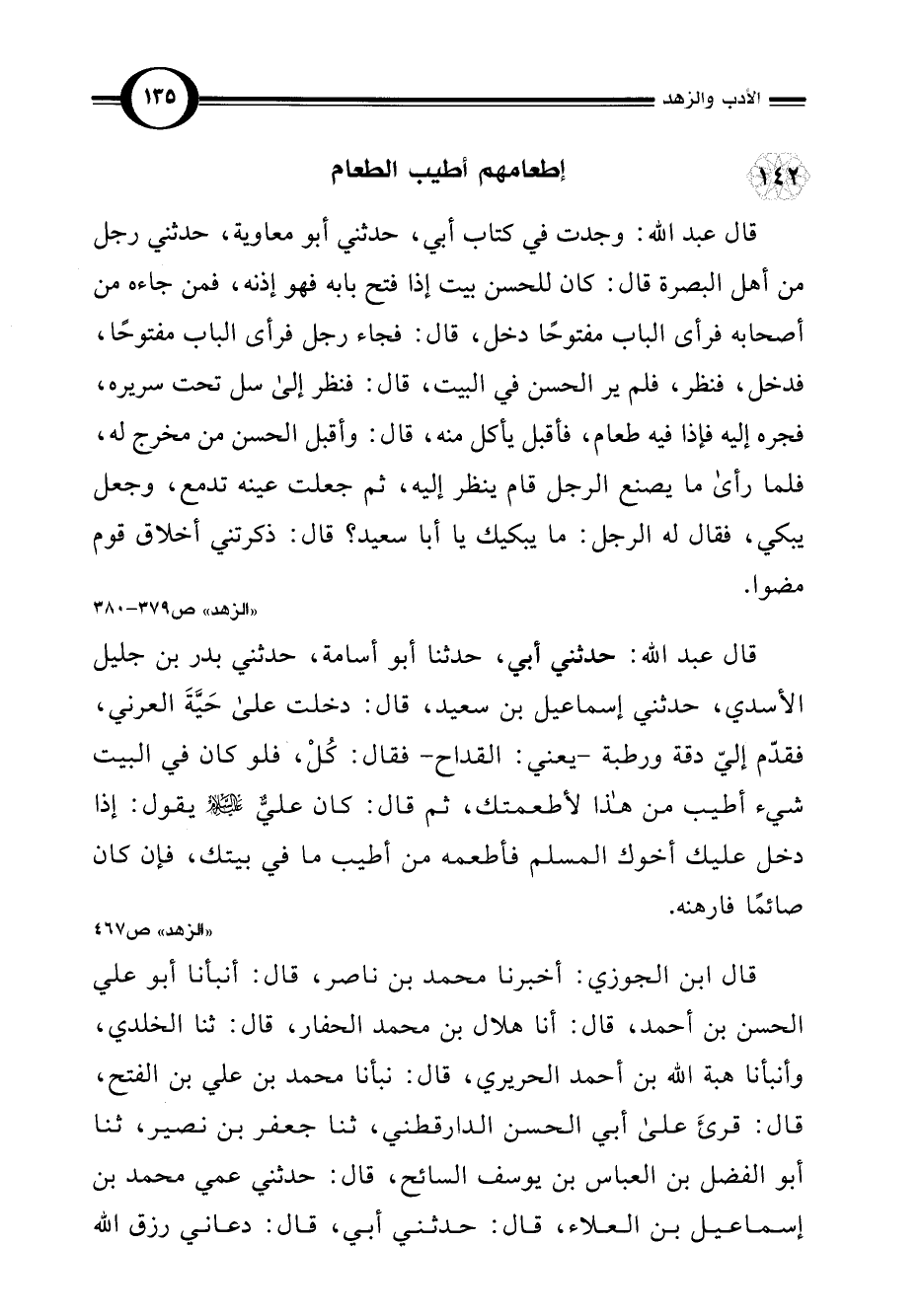 قال عبد اللَّه: حدثني أبي، حدثنا أبو أسامة، حدثني بدر بن جليل الأسدي، حدثني إسماعيل بن سعيد، قال: دخلت على حَيَّةَ العرني، فقدّم إليّ دقة ورطبة -يعني: القداح- فقال: كُلْ، فلو كان في البيت شيء أطيب من هذا لأطعمتك، ثم قال: كان عليٌّ عليه السلام يقول: إذا دخل عليك أخوك المسلم فأطعمه من أطيب ما في بيتك، فإن كان صائمًا فارهنه.