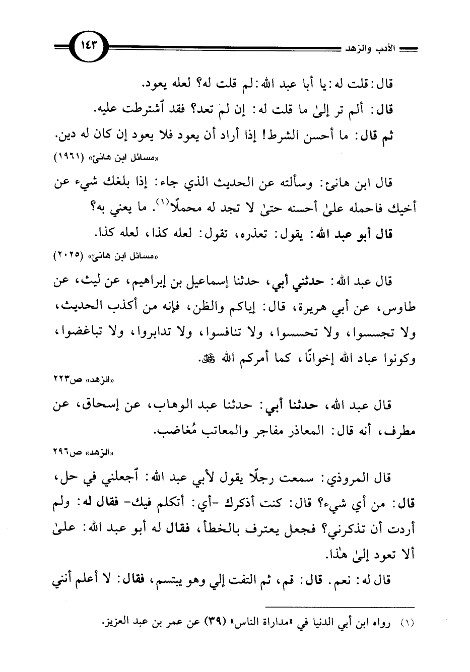 قال المروذي: سمعت رجلًا يقول لأبي عبد اللَّه: اجعلني في حل، قال: من أي شيء؟ قال: كنت أذكرك -أي: أتكلم فيك- فقال له: ولم أردت أن تذكرني؟ فجعل يعترف بالخطأ، فقال له أبو عبد اللَّه: على ألا تعود إلى هذا.