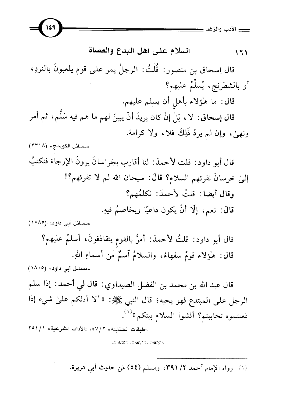 قال أبو داود: قلت لأحمدَ: لنا أقارب بخراسانَ يرونَ الإرجاءَ فنكتبُ إلى خراسانَ نقرئهم السلام؟ قالَ: سبحان اللَّه لم لا تقرئهم؟ !