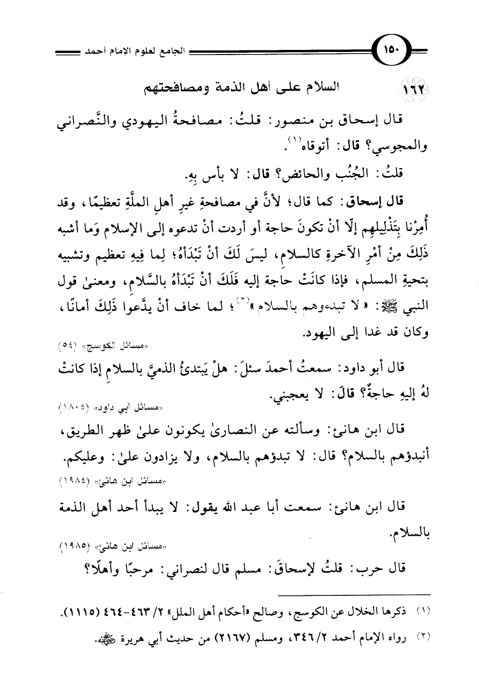 قال ابن هانئ: وسألته عن النصارى يكونون على ظهر الطريق، أنبدؤهم بالسلام؟ قال: لا تبدؤهم بالسلام، ولا يزادون على: وعليكم.