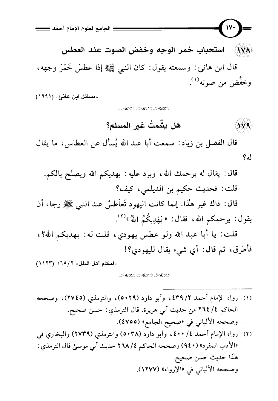 قال ابن هانئ: وسمعته يقول: كان النبي -صلى اللَّه عليه وسلم- إذا عطسَ خَمّرَ وجهه، وخفَّض من صوته (¬1).