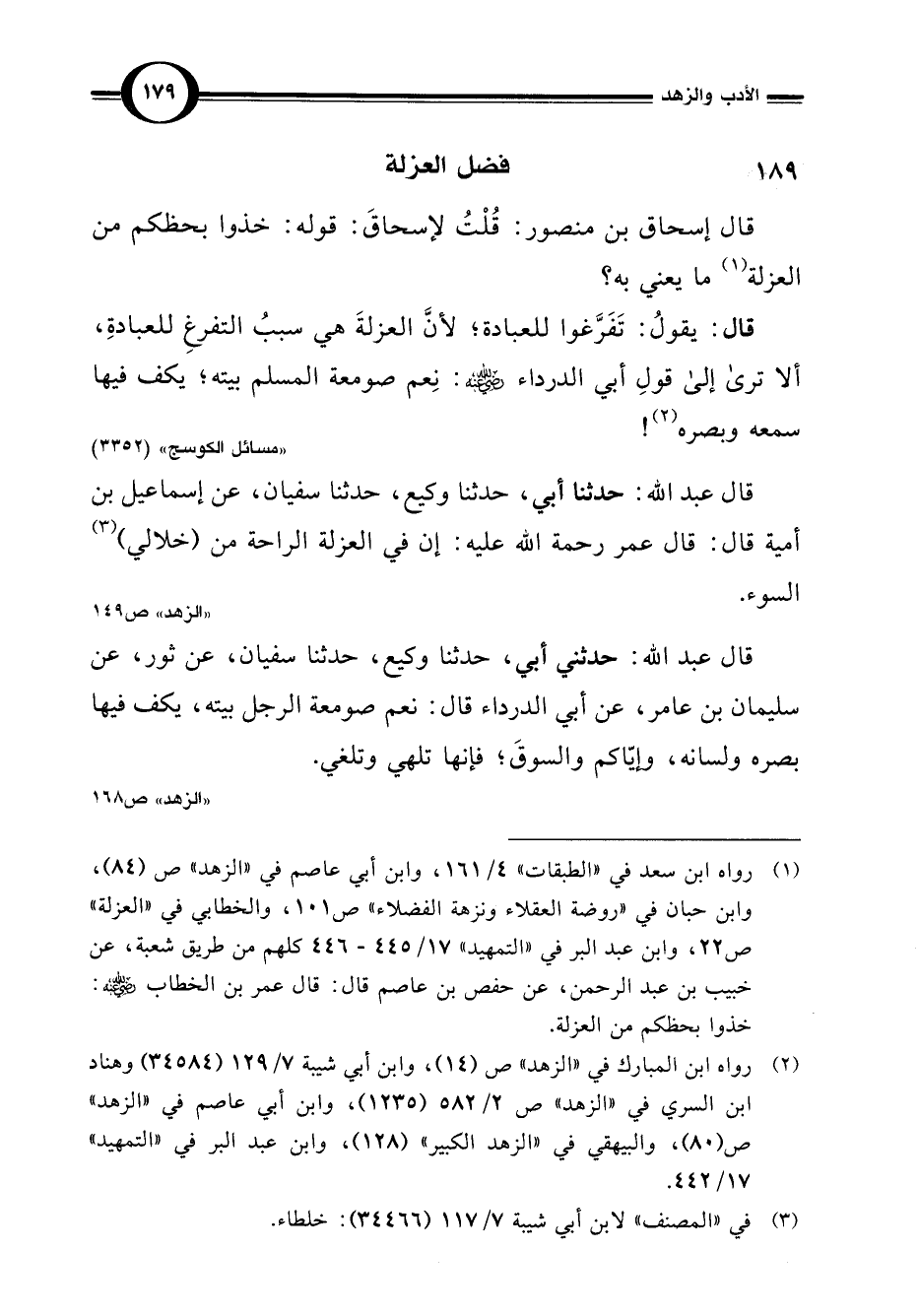 قال إسحاق بن منصور: قُلْتُ لإسحاقَ: قوله: خذوا بحظكم من العزلة (¬1) ما يعني به؟