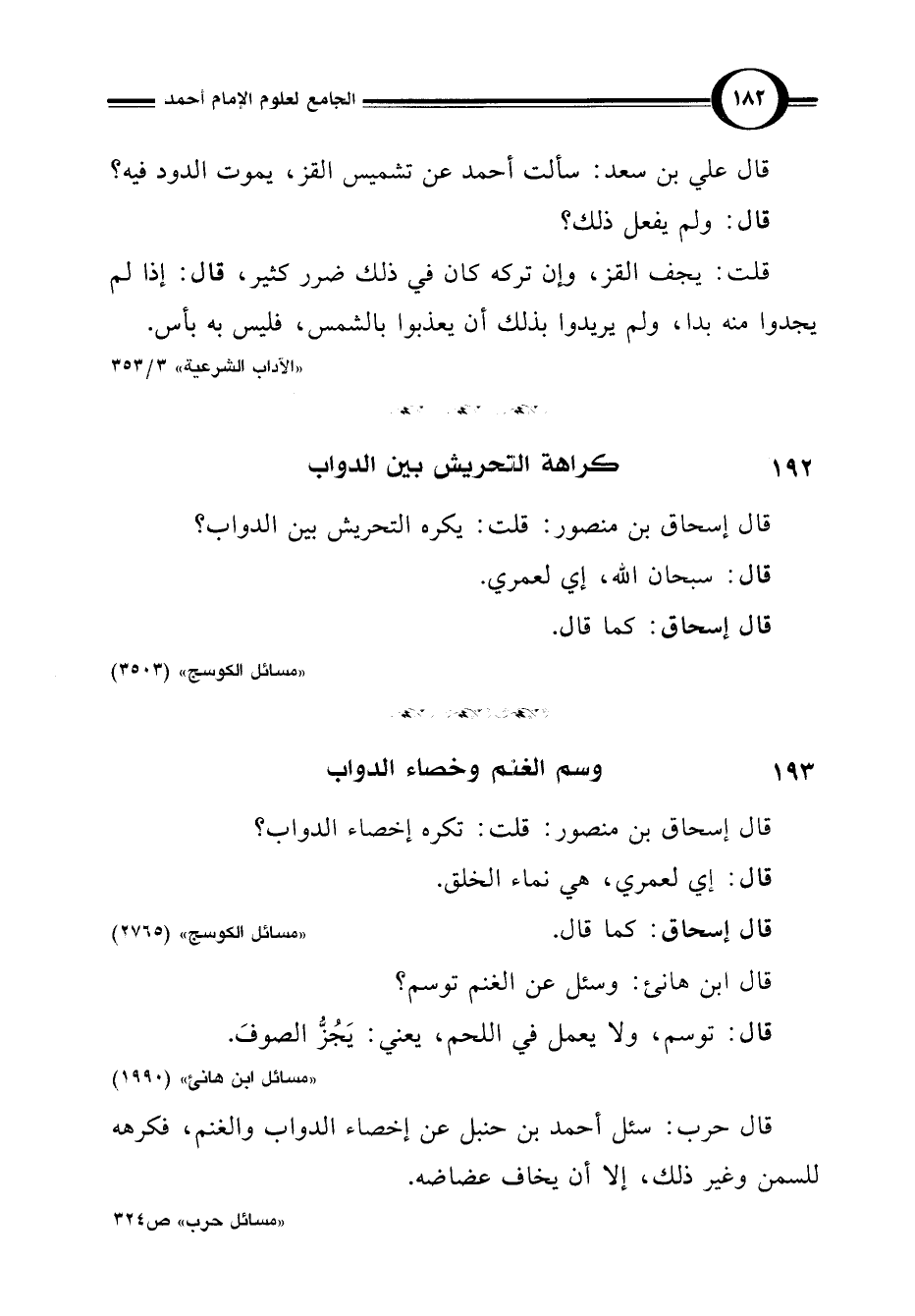 قال إسحاق بن منصور: قلت: يكره التحريش بين الدواب؟