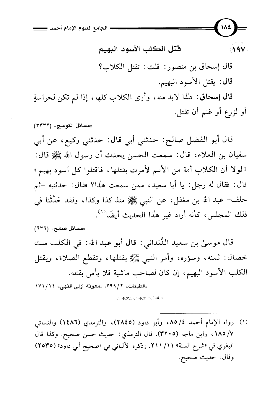 قال أبو الفضل صالح: حدثني أبي قال: حدثني وكيع، عن أبي سفيان بن العلاء، قال: سمعت الحسن يحدث أن رسول اللَّه -صلى اللَّه عليه وسلم- قال: "لولا أن الكلاب أمة من الأمم لأمرت بقتلها، فاقتلوا كل أسود بهيم" قال: فقال له رجل: يا أبا سعيد، ممن سمعت هذا؟ فقال: حدثنيه -ثم حلف- عبد اللَّه بن مغفل، عن النبي -صلى اللَّه عليه وسلم- منذ كذا وكذا، ولقد حَدَّثَنا في ذلك المجلس، كأنه أراد غير هذا الحديث أيضًا (¬1).