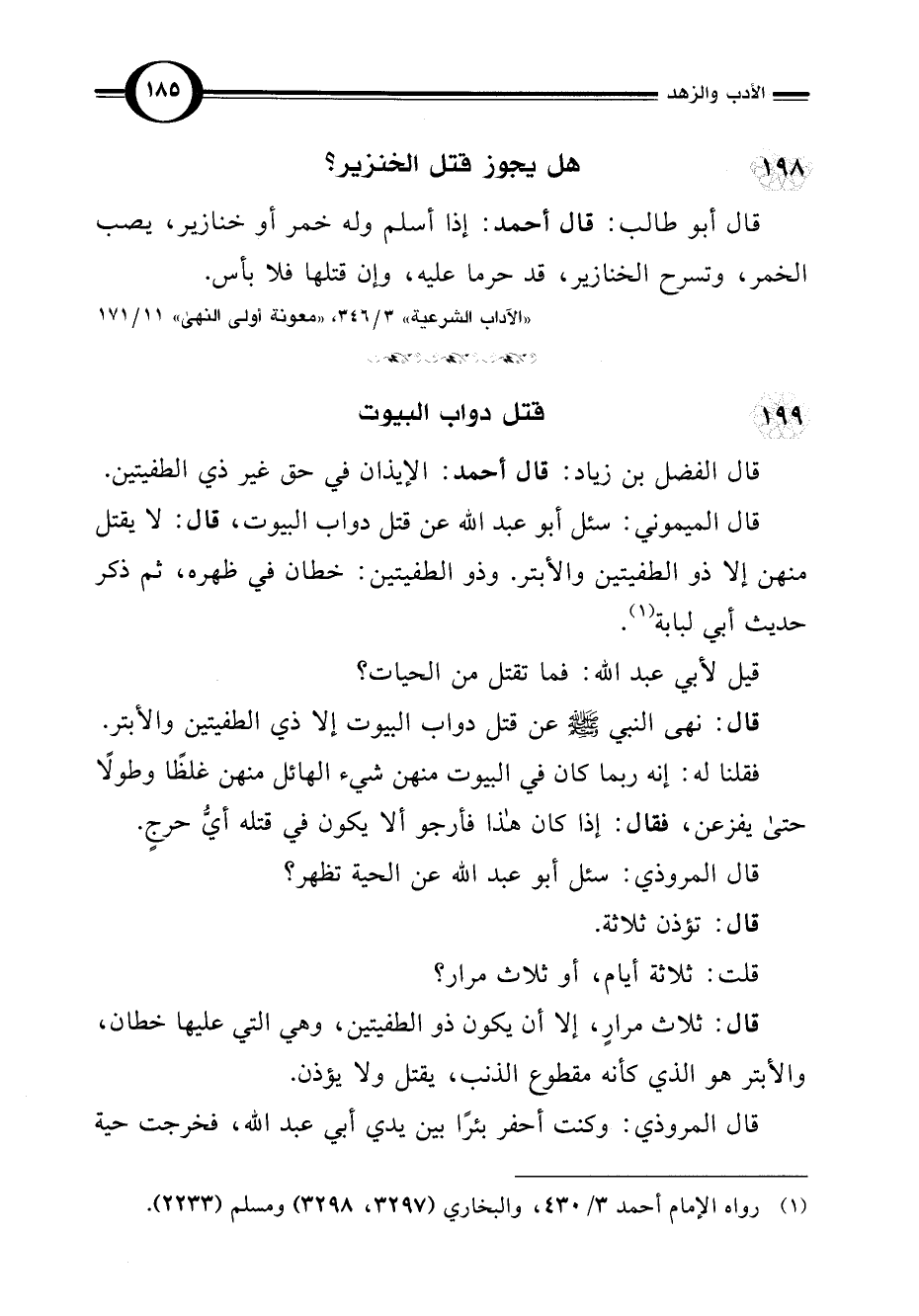قال الميموني: سئل أبو عبد اللَّه عن قتل دواب البيوت، قال: لا يقتل منهن إلا ذو الطفيتين والأبتر. وذو الطفيتين: خطان في ظهره، ثم ذكر حديث أبي لبابة (¬1).