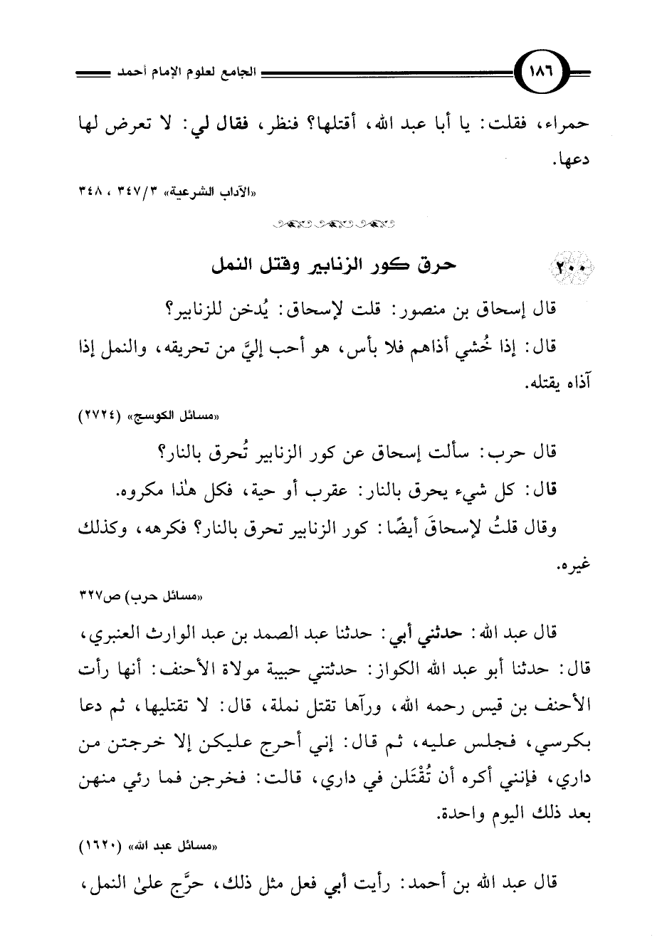 قال عبد اللَّه بن أحمد: رأيت أبي فعل مثل ذلك، حرَّج على النمل،