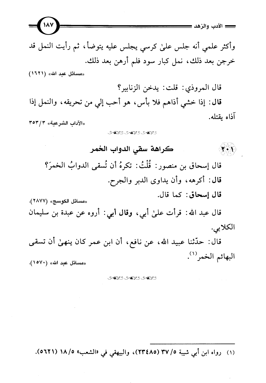قال إسحاق بن منصور: قُلْتُ: تكرهُ أن تُسقى الدوابُ الخمرَ؟