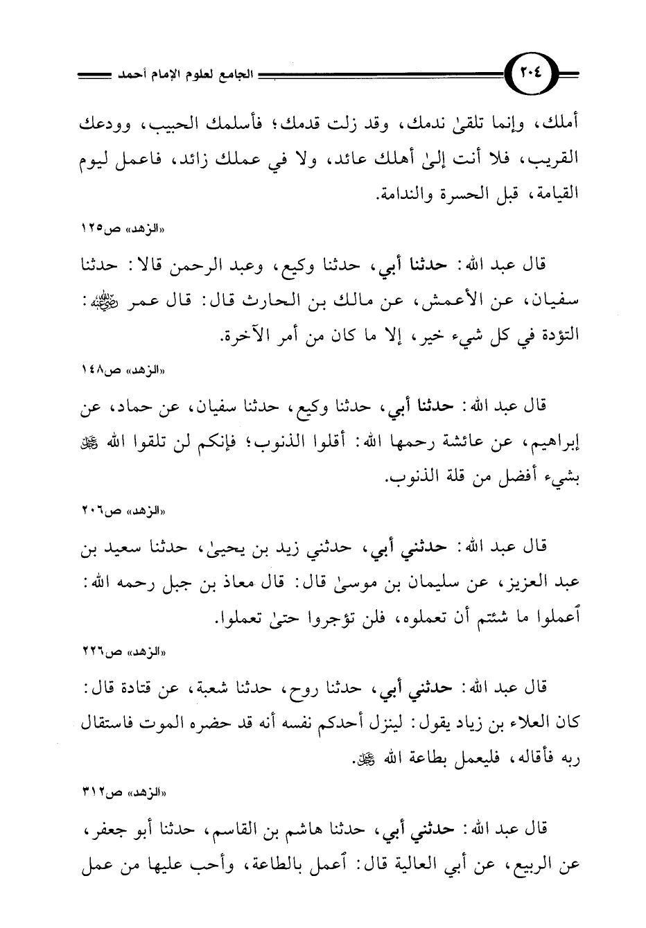 قال عبد اللَّه: حدثني أبي، حدثني زيد بن يحيى، حدثنا سعيد بن عبد العزيز، عن سليمان بن موسى قال: قال، معاذ بن جبل رحمه اللَّه: اعملوا ما شئتم أن تعملوه، فلن تؤجروا حتى تعملوا.
