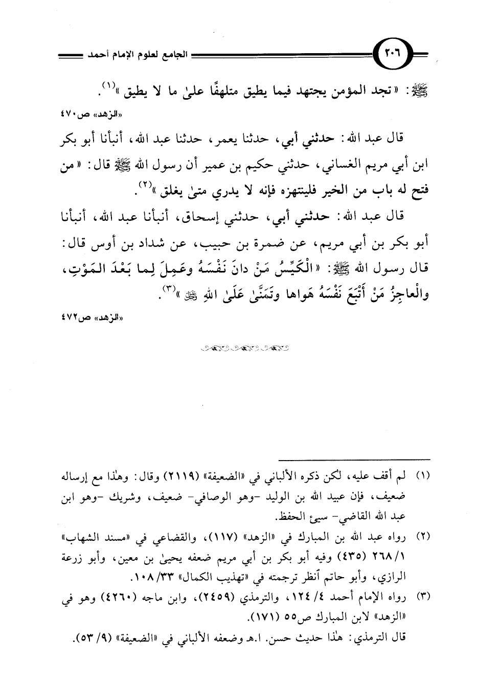 قال عبد اللَّه: حدثني أبي، حدثني إسحاق، أنبأنا عبد اللَّه، أنبأنا أبو بكر بن أبي مريم، عن ضمرة بن حبيب، عن شداد بن أوس قال: قال رسول اللَّه -صلى اللَّه عليه وسلم-: "الْكَيِّسُ مَنْ دانَ نَفْسَهُ وعَمِلَ لِما بَعْدَ المَوْتِ، والْعاجِزُ مَنْ أَتْبَعَ نَفْسَهُ هَواها وتَمَنَّى عَلَى اللَّهِ عز وجل" (¬3).