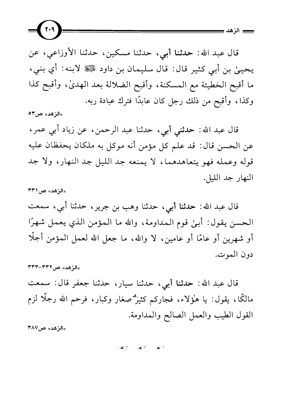 قال عبد اللَّه: حدثنا أبي، حدثنا وهب بن جرير، حدثنا أبي، سمعت الحسن يقول: أبي قوم المداومة، واللَّه ما المؤمن الذي يعمل شهرًا أو شهرين أو عامًا أو عامين، لا واللَّه، ما جعل اللَّه لعمل المؤمن أجلًا دون الموت.