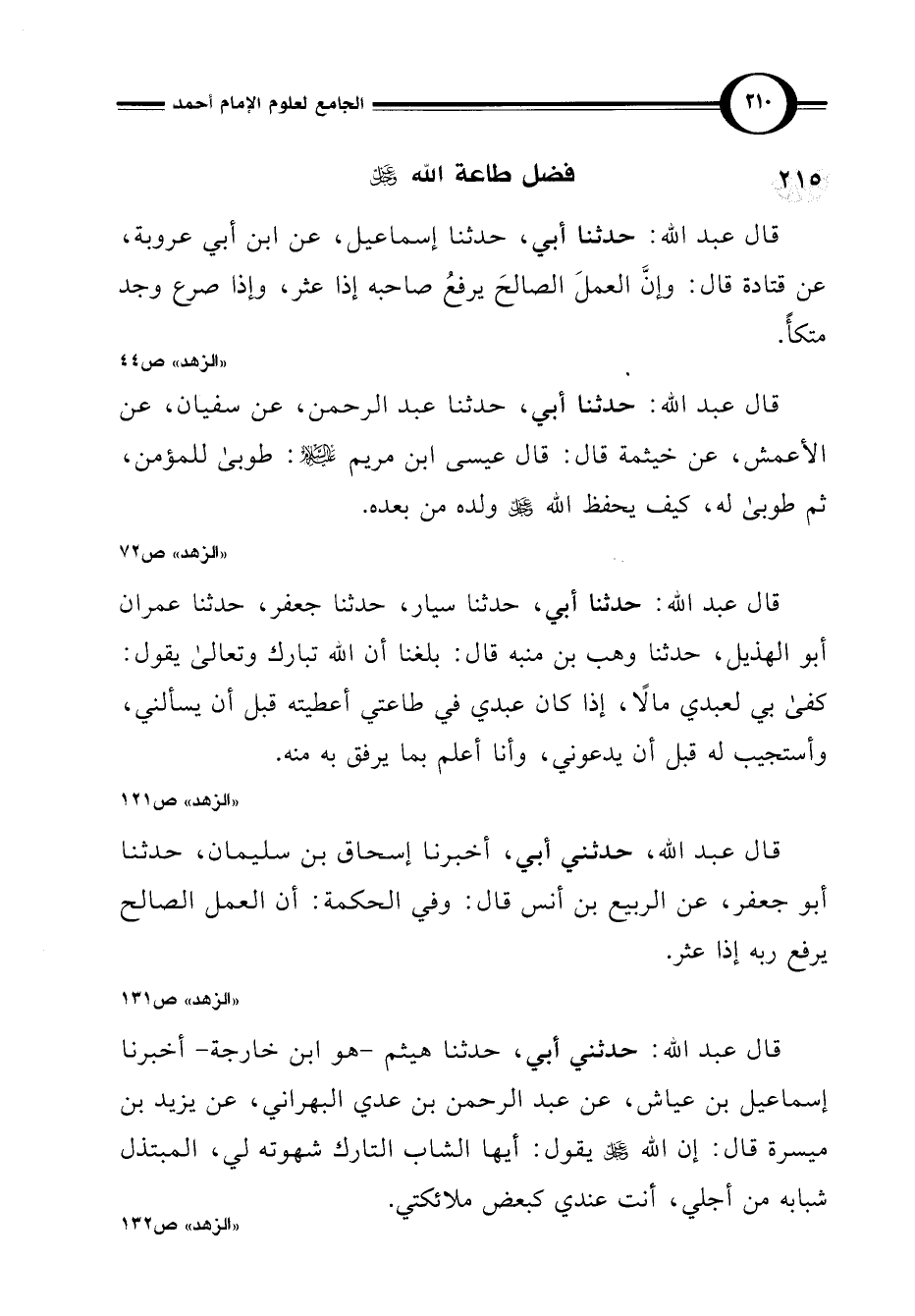 قال عبد اللَّه، حدثني أبي، أخبرنا إسحاق بن سليمان، حدثنا أبو جعفر، عن الربيع بن أنس قال: وفي الحكمة: أن العمل الصالح يرفع ربه إذا عثر.