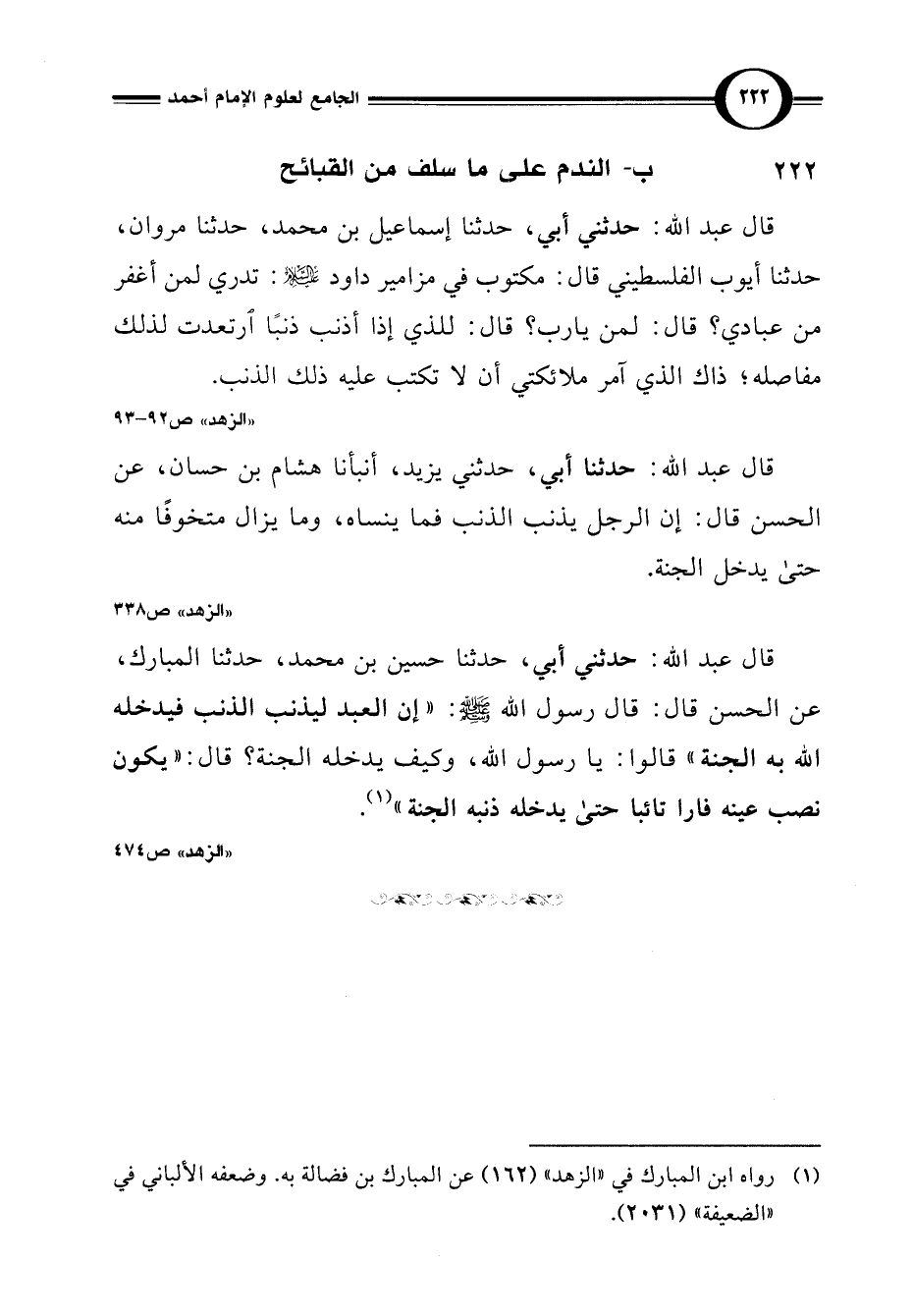 قال عبد اللَّه: حدثني أبي، حدثنا إسماعيل بن محمد، حدثنا مروان، حدثنا أيوب الفلسطيني قال: مكتوب في مزامير داود عليه السلام: تدري لمن اغفر من عبادي؟ قال: لمن يارب؟ قال: للذي إذا أذنب ذنبًا ارتعدت لذلك مفاصله؛ ذاك الذي آمر ملائكتي أن لا تكتب عليه ذلك الذنب.