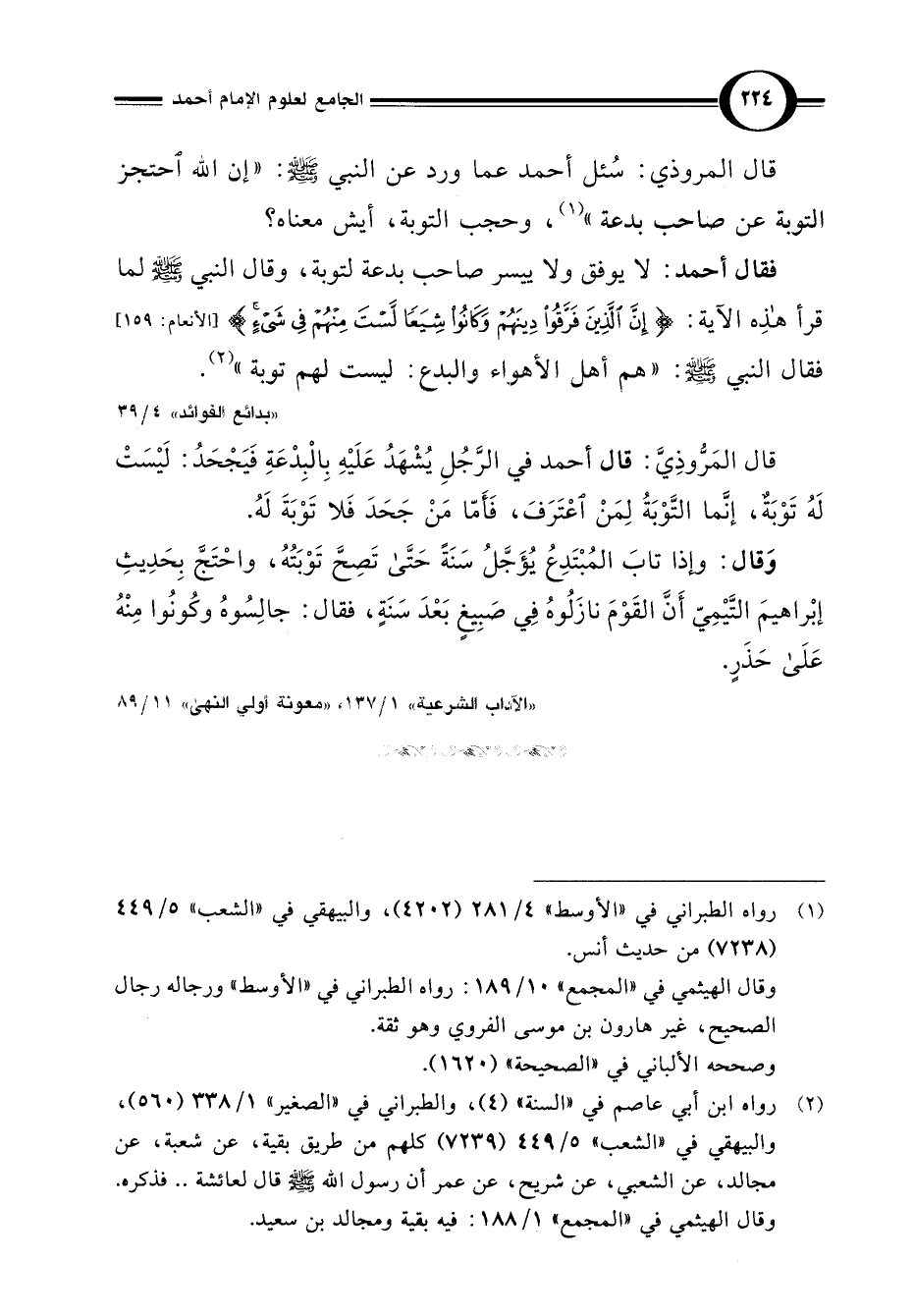 فقال أحمد: لا يوفق ولا ييسر صاحب بدعة لتوبة، وقال النبي -صلى اللَّه عليه وسلم- لما قرأ هذِه الآية: {إِنَّ الَّذِينَ فَرَّقُوا دِينَهُمْ وَكَانُوا شِيَعًا لَسْتَ مِنْهُمْ فِي شَيْءٍ} [الأنعام: 159]، فقال النبي -صلى اللَّه عليه وسلم-: "هم أهل الأهواء والبدع: ليست لهم توبة" (¬2).