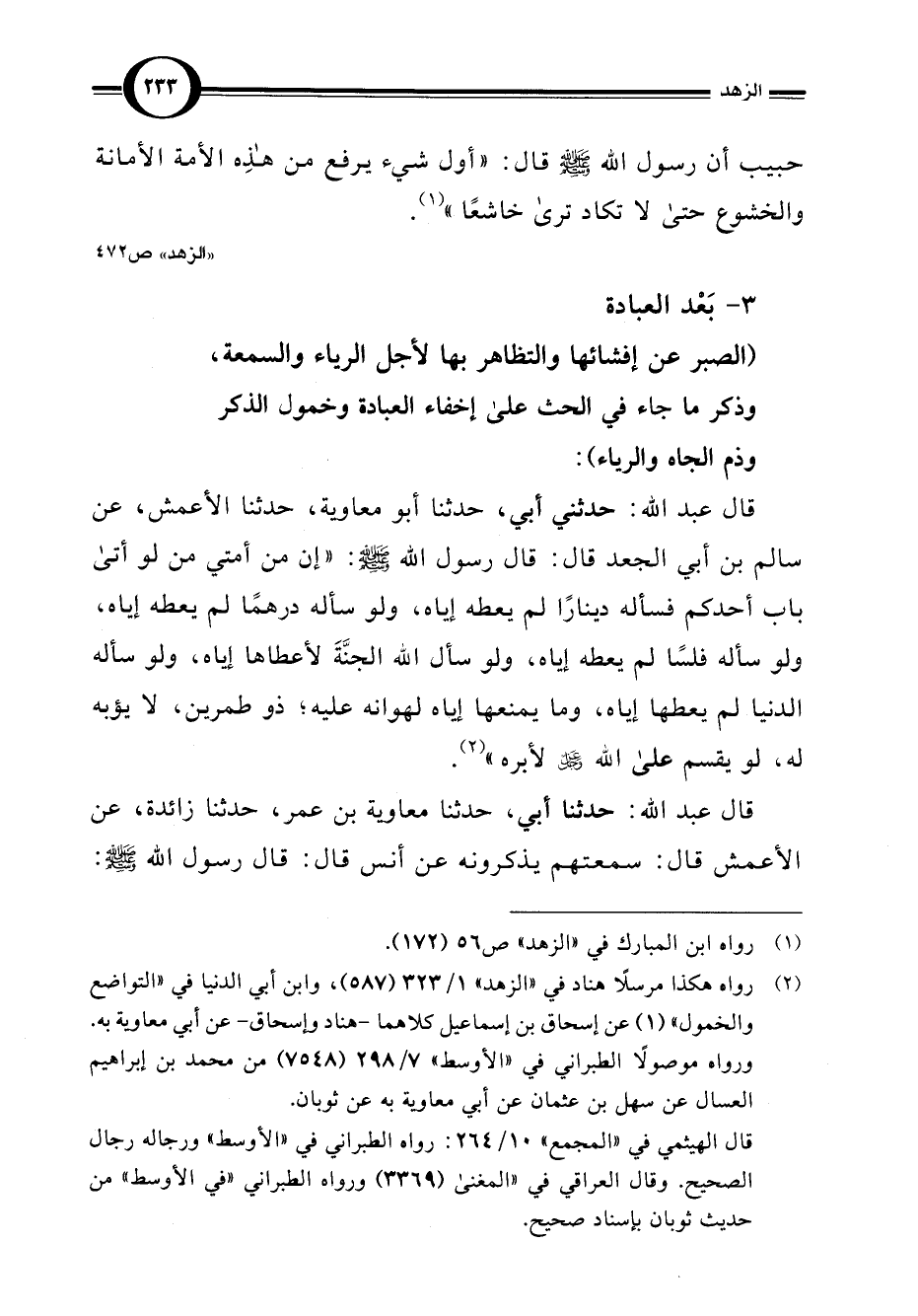 (الصبر عن إفشائها والتظاهر بها لأجل الرياء والسمعة، وذكر ما جاء في الحث على إخفاء العبادة وخمول الذكر وذم الجاه والرياء):