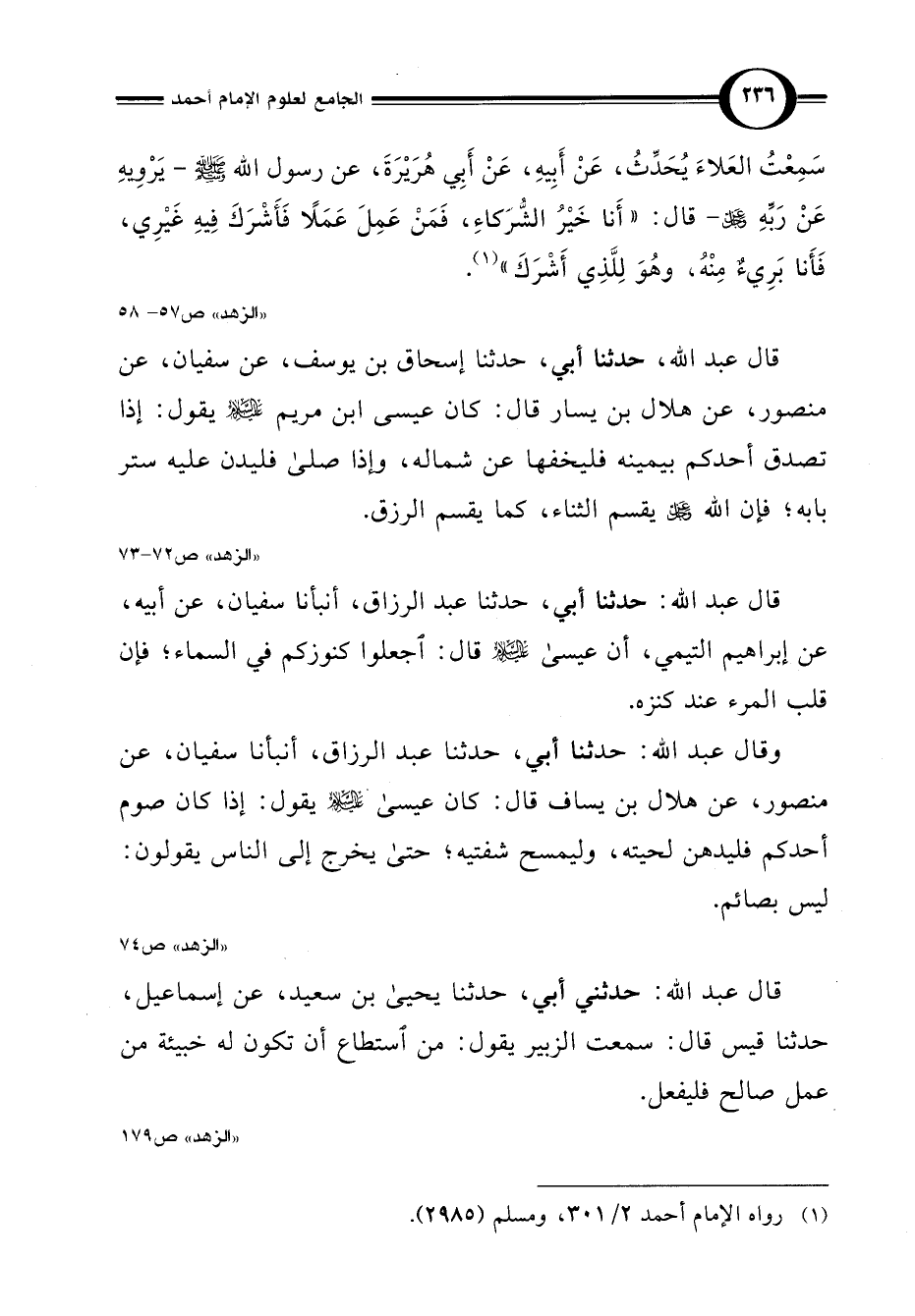 قال عبد اللَّه، حدثنا أبي، حدثنا إسحاق بن يوسف، عن سفيان، عن منصور، عن هلال بن يسار قال: كان عيسى ابن مريم عليه السلام يقول: إذا تصدق أحدكم بيمينه فليخفها عن شماله، وإذا صلى فليدن عليه ستر بابه؛ فإن اللَّه عز وجل يقسم الثناء، كما يقسم الرزق.
