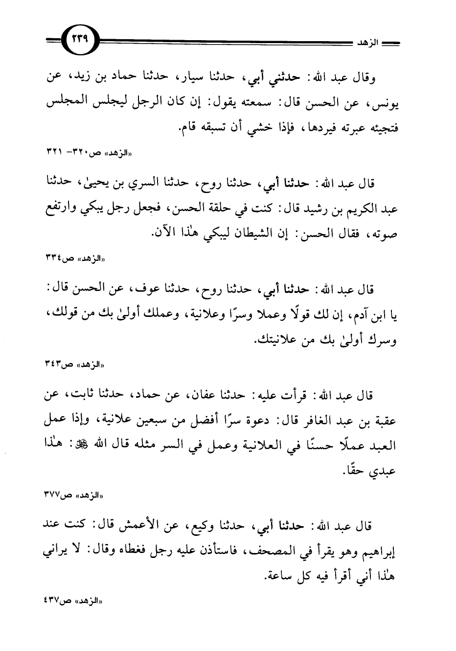 وقال عبد اللَّه: حدثني أبي، حدثنا سيار، حدثنا حماد بن زيد، عن يونس، عن الحسن قال: سمعته يقول: إن كان الرجل ليجلس المجلس فتجيئه عبرته فيردها، فإذا خشي أن تسبقه قام.