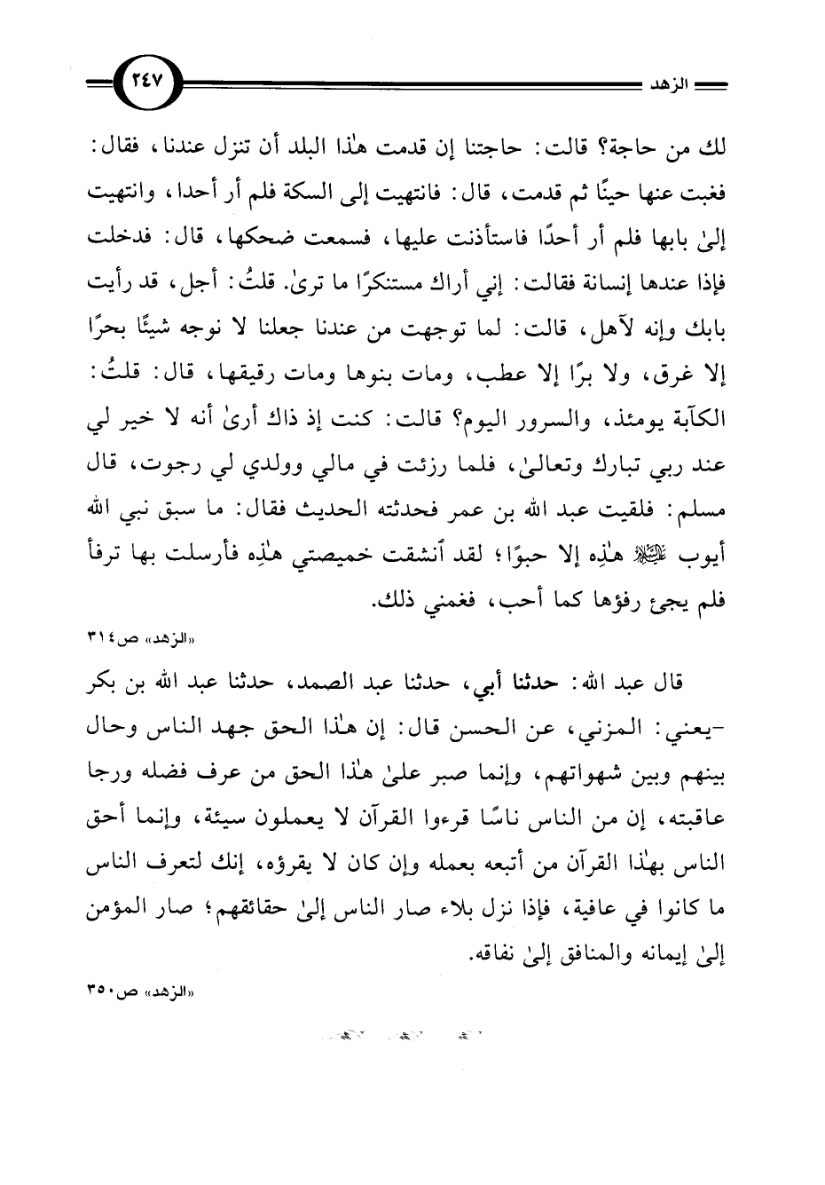 لك من حاجة؟ قالت: حاجتنا إن قدمت هذا البلد أن تنزل عندنا، فقال: فغبت عنها حينا ثم قدمت، قال: فانتهيت إلى السكة فلم أر أحدا، وانتهيت إلى بابها فلم أر أحدًا فاستأذنت عليها، فسمعت ضحكها، قال: فدخلت فإذا عندها إنسانة فقالت: إني أراك مستنكرًا ما ترى. قلتُ: أجل، قد رأيت بابك وإنه لآهل، قالت: لما توجهت من عندنا جعلنا لا نوجه شيئًا بحرًا إلا غرق، ولا برًا إلا عطب، ومات بنوها ومات رقيقها، قال: قلتُ: الكآبة يومئذ، والسرور اليوم؟ قالت: كنت إذ ذاك أرى أنه لا خير لي عند ربي تبارك وتعالى، فلما رزئت في مالي وولدي لي رجوت، قال مسلم: فلقيت عبد اللَّه بن عمر فحدثته الحديث فقال: ما سبق نبي اللَّه أيوب عليه السلام هذِه إلا حبوًا؛ لقد انشقت خميصتي هذِه فأرسلت بها ترفأ فلم يجئ رفؤها كما أحب، فغمني ذلك.