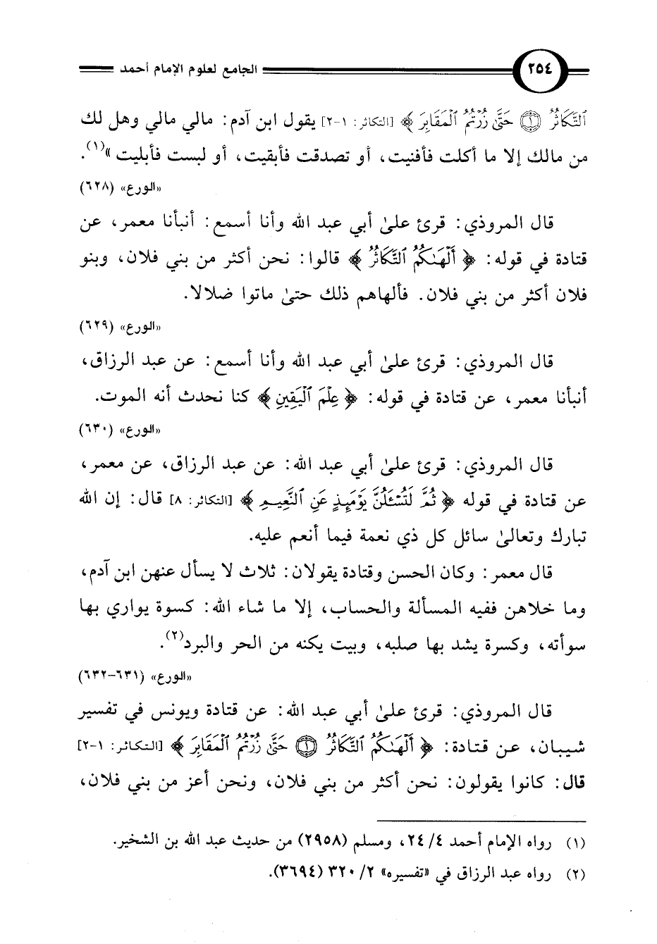 قال المروذي: قرئ على أبي عبد اللَّه: عن قتادة ويونس في تفسير شيبان، عن قتادة: {أَلْهَاكُمُ التَّكَاثُرُ (1) حَتَّى زُرْتُمُ الْمَقَابِرَ} [التكاثر: 1 - 2] قال: كانوا يقولون: نحن أكثر من بني فلان، ونحن أعز من بني فلان،
