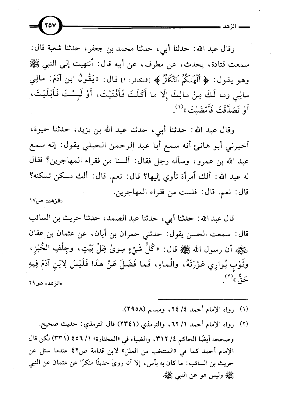 قال عبد اللَّه: حدثنا أبي، حدثنا عبد الصمد، حدثنا حريث بن السائب قال: سمعت الحسن يقول: حدثني حمران بن أبان، عن عثمان بن عفان -رضي اللَّه عنه- أن رسول اللَّه -صلى اللَّه عليه وسلم- قال: "كُلّ شَيْءٍ سِوى ظِلِّ بَيْتٍ، وجِلْفِ الخُبْزِ، وثَوْب يوارِي عَوْرَتَة، والْماءِ، فَما فَضَلَ عَنْ هذا فَلَيْسَ لِابْنِ آدَمَ فِيهِ حَقٌّ" (¬2).