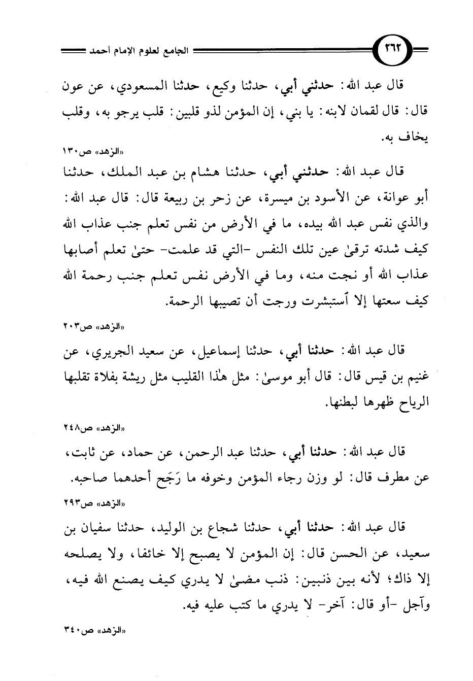 قال عبد اللَّه: حدثني أبي، حدثنا وكيع، حدثنا المسعودي، عن عون قال: قال لقمان لابنه: يا بني، إن المؤمن لذو قلبين: قلب يرجو به، وقلب يخاف به.