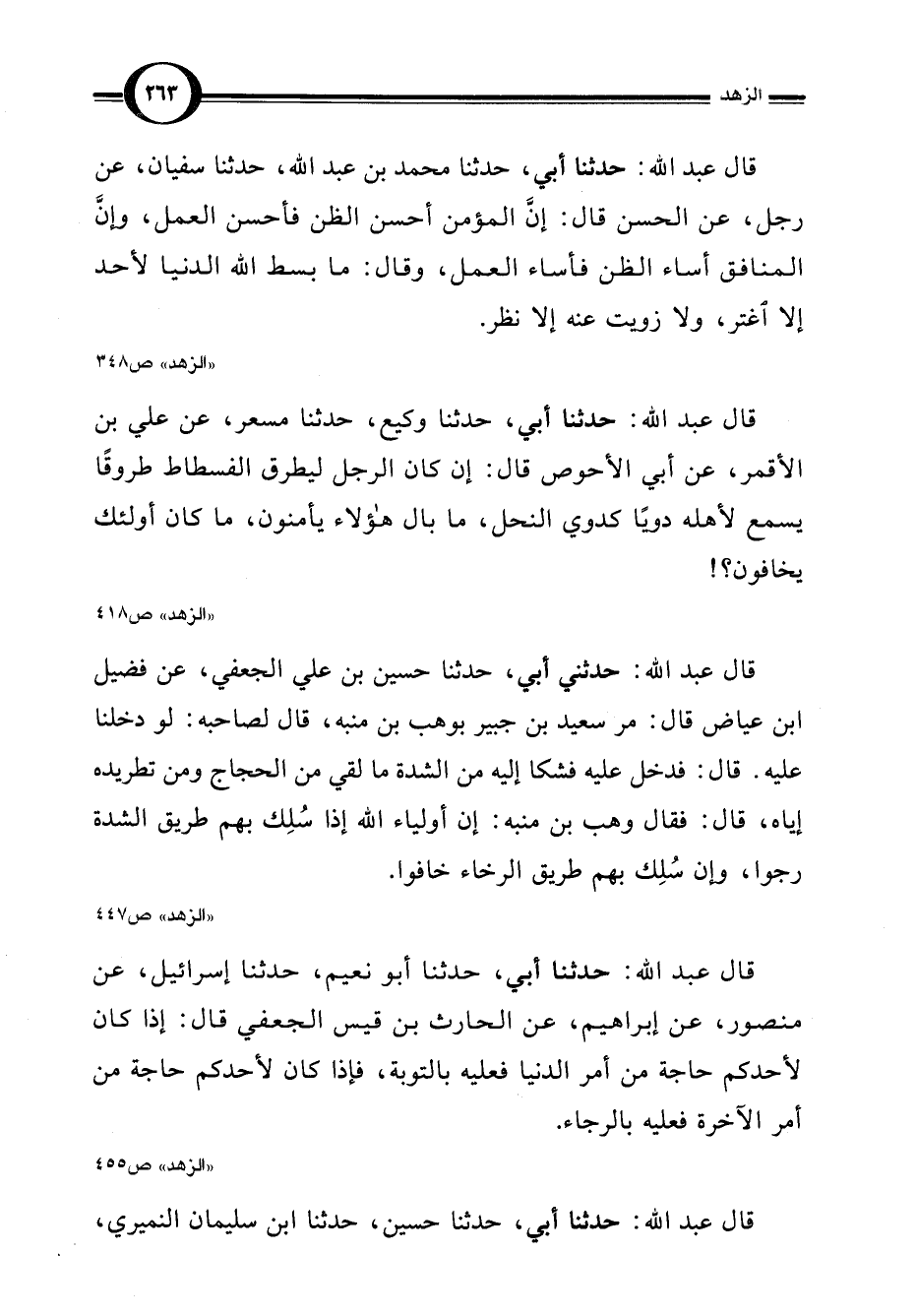 قال عبد اللَّه: حدثنا أبي، حدثنا محمد بن عبد اللَّه، حدثنا سفيان، عن رجل، عن الحسن قال: إنَّ المؤمن أحسن الظن فأحسن العمل، وإنَّ المنافق أساء الظن فأساء العمل، وقال: ما بسط اللَّه الدنيا لأحد إلا اغتر، ولا زويت عنه إلا نظر.