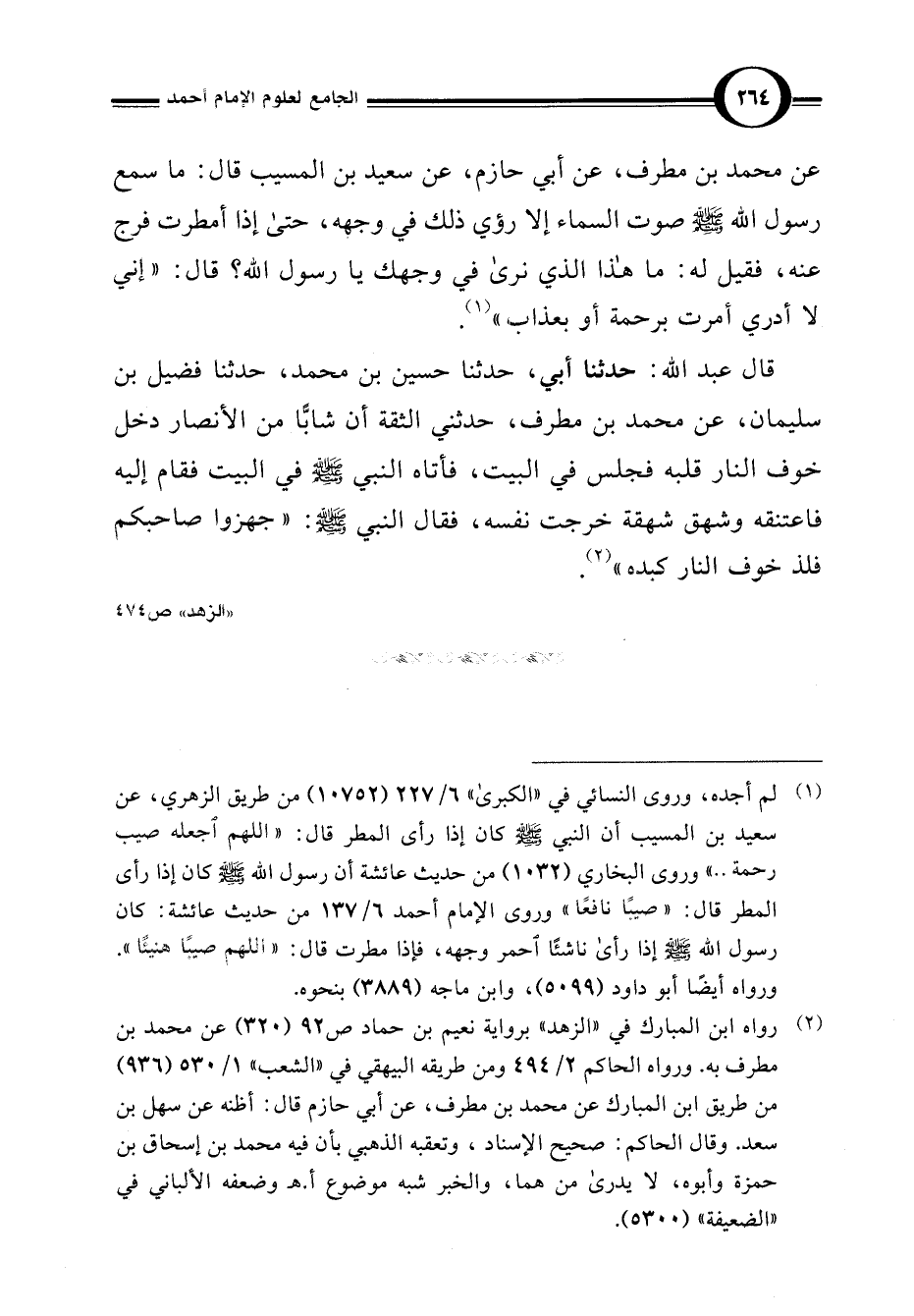 (¬2) رواه ابن المبارك في "الزهد" برواية نعيم بن حماد ص 92 (320) عن محمد بن مطرف به. ورواه الحاكم 2/ 494 ومن طريقه البيهقي في "الشعب" 1/ 530 (936) من طريق ابن المبارك عن محمد بن مطرف، عن أبي حازم قال: أظنه عن سهل بن سعد. وقال الحاكم: صحيح الإسناد، وتعقبه الذهبي بأن فيه محمد بن إسحاق بن حمزة وأبوه، لا يدرى من هما، والخبر شبه موضوع أ. هـ وضعفه الألباني في "الضعيفة" (5300).
