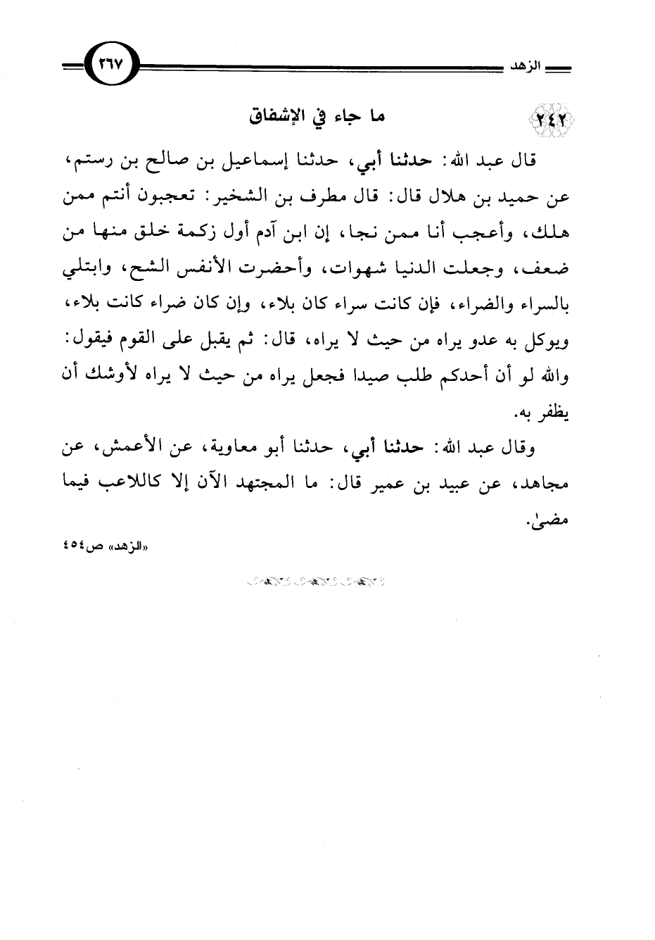 قال عبد اللَّه: حدثنا أبي، حدثنا إسماعيل بن صالح بن رستم، عن حميد بن هلال قال: قال مطرف بن الشخير: تعجبون أنتم ممن هلك، وأعجب أنا ممن نجا، إن ابن آدم أول زكمة خلق منها من ضعف، وجعلت الدنيا شهوات، وأحضرت الأنفس الشح، وابتلي بالسراء والضراء، فإن كانت سراء كان بلاء، وإن كان ضراء كانت بلاء، ويوكل به عدو يراه من حيث لا يراه، قال: ثم يقبل على القوم فيقول: واللَّه لو أن أحدكم طلب صيدا فجعل يراه من حيث لا يراه لأوشك أن يظفر به.