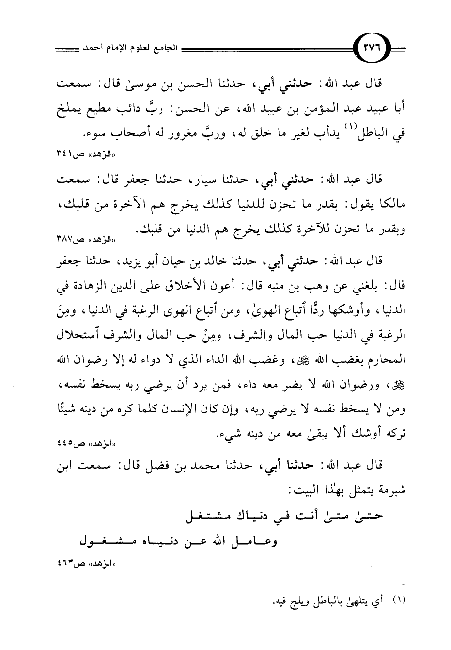 قال عبد اللَّه: حدثني أبي، حدثنا خالد بن حيان أبو يزيد، حدثنا جعفر قالْ بلغني عن وهب بن منبه قال: أعون الأخلاق على الدين الزهادة في الدنيا، وأوشكها ردًّا اتباع الهوى، ومن اتباع الهوى الرغبة في الدنيا، ومِنَ الرغبة في الدنيا حب المال والشرف، ومِنْ حب المال والشرف استحلال المحارم بغضب اللَّه عز وجل، وغضب اللَّه الذى الذي لا دواء له إلا رضوان اللَّه عز وجل، ورضوان اللَّه لا يضر معه داء، فمن يرد أن يرضي ربه يسخط نفسه، ومن لا يسخط نفسه لا يرضي ربه، وإن كان الإنسان كلما كره من دينه شيئًا تركه أوشك ألا يبقى معه من دينه شيء.