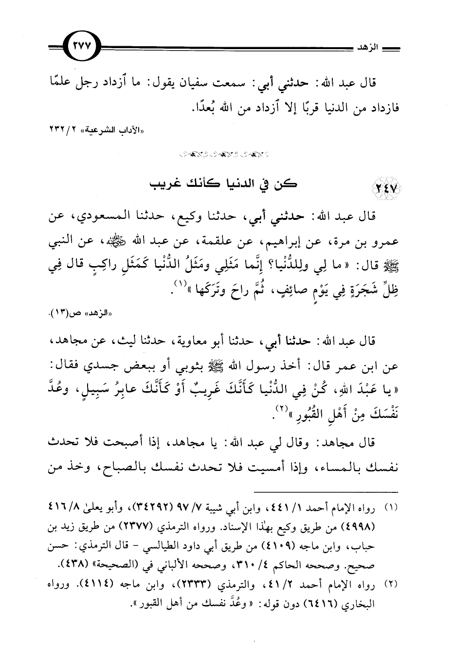 قال عبد اللَّه: حدثنا أبي، حدثنا أبو معاوية، حدثنا ليث، عن مجاهد، عن ابن عمر قال: أخذ رسول اللَّه -صلى اللَّه عليه وسلم- بثوبي أو ببعض جسدي فقال: "يا عَبْدَ اللَّهِ، كُنْ فِي الدُّنْيا كَأَنَّكَ غَرِيبٌ أَوْ كَأَنَّكَ عابِرُ سَبِيلٍ، وعُدَّ نَفْسَكَ مِنْ أَهْلِ القُبُورِ" (¬2).