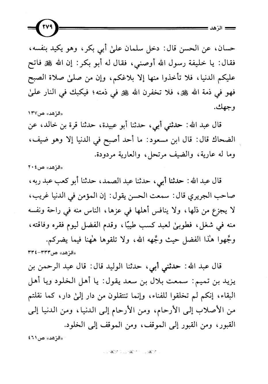 قال عبد اللَّه: حدثني أبي، حدثنا أبو عبيدة، حدثنا قرة بن خالد، عن الضحاك قال: قال ابن مسعود: ما أحد أصبح في الدنيا إلا وهو ضيف، وما له عارية، والضيف مرتحل، والعارية مردودة.