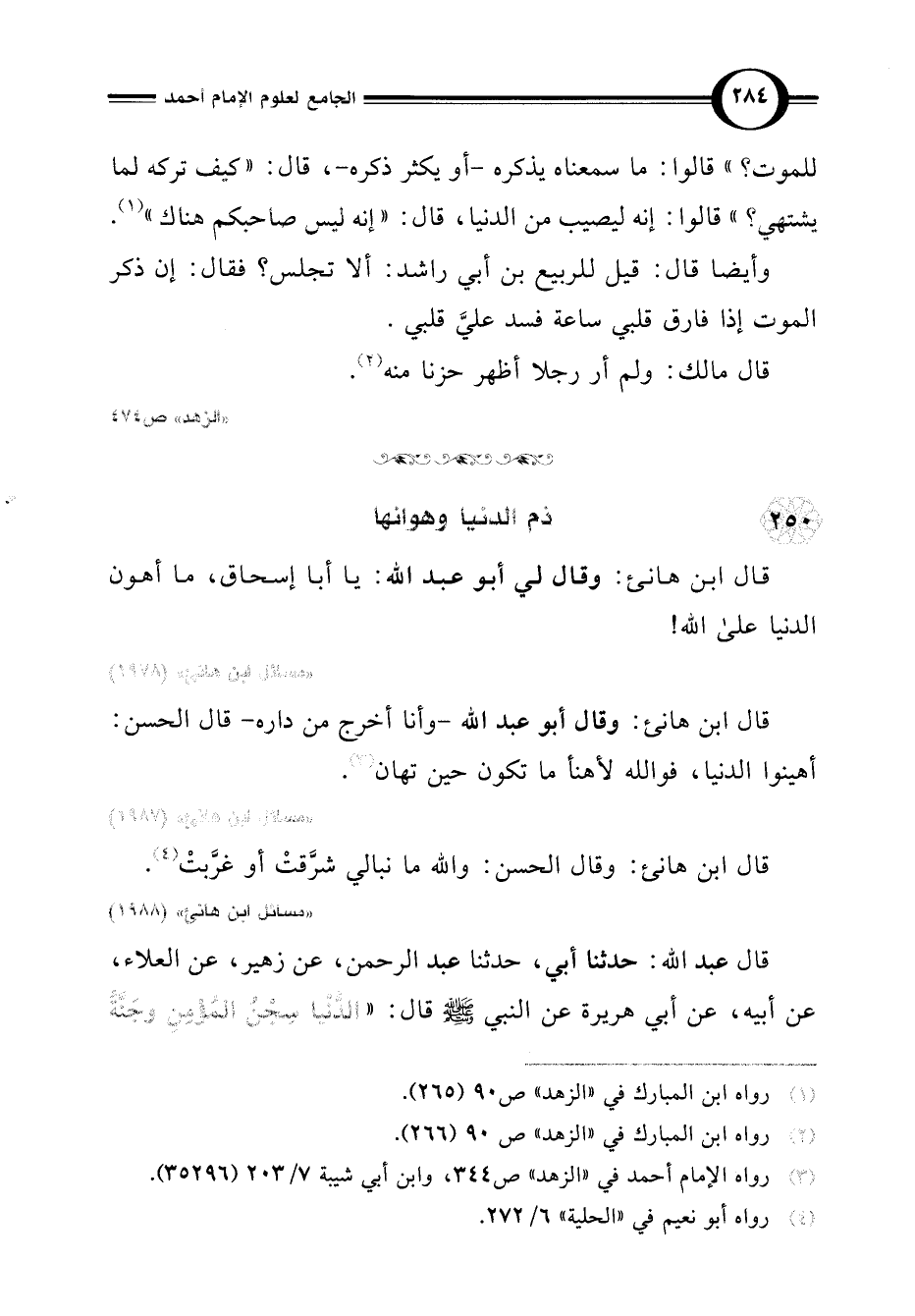 قال ابن هانئ: وقال أبو عبد اللَّه -وأنا أخرج من داره- قال الحسن: أهينوا الدنيا، فواللَّه لأهنأ ما تكون حين تهان (¬3).