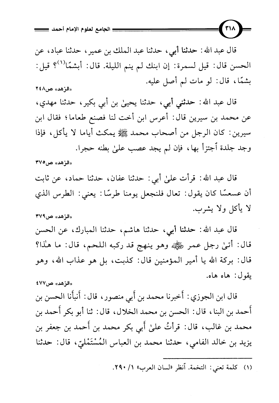 قال عبد اللَّه: حدثني أبي، حدثنا يحيى بن أبي بكير، حدثنا مهدي، عن محمد بن سيرين قال: أعرس ابن أخت لنا فصنع طعامًا؛ فقال ابن سيرين: كان الرجل من أصحاب محمد -صلى اللَّه عليه وسلم- يمكث أيامًا لا يأكل، فإذا وجد جلدة اجتزأ بها، فإن لم يجد عصب على بطنه حجرًا.