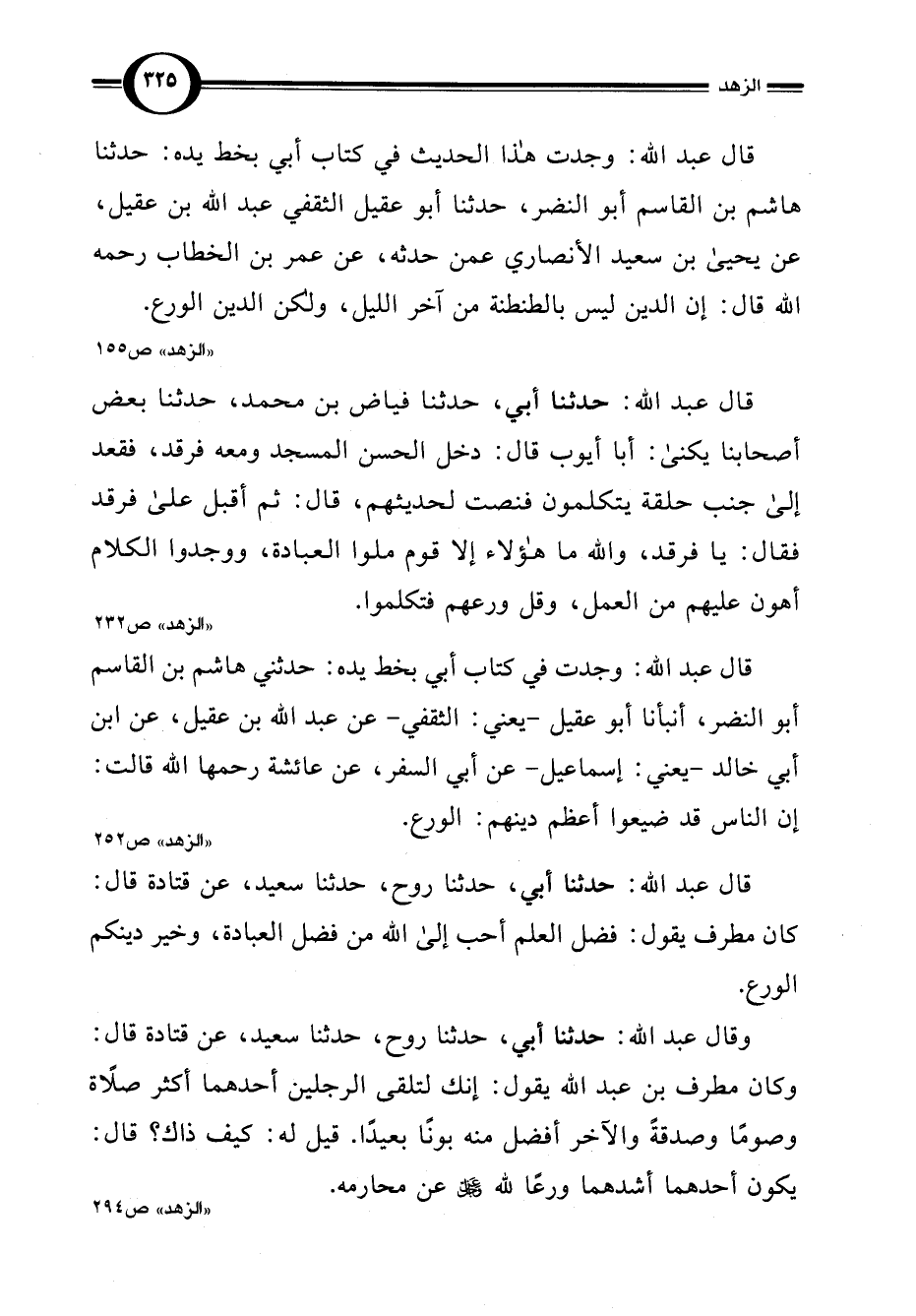 قال عبد اللَّه: وجدت هذا الحديث في كتاب أبي بخط يده: حدثنا هاشم بن القاسم أبو النضر، حدثنا أبو عقيل الثقفي عبد اللَّه بن عقيل، عن يحيى بن سعيد الأنصاري عمن حدثه، عن عمر بن الخطاب رحمه اللَّه قال: إن الدين ليس بالطنطنة من آخر الليل، ولكن الدين الورع.