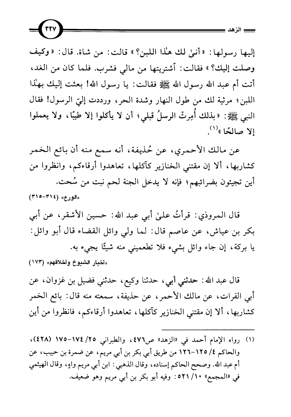 قال عبد اللَّه: حدثني أبي، حدثنا وكيع، حدثني فضيل بن غزوان، عن أبي الفرات، عن مالك الأحمر، عن حذيفة، سمعته منه قال: بائع الخمر كشاربها، ألا إن مقتني الخنازير كآكلها، تعاهدوا أرقاءكم، فانظروا من أين